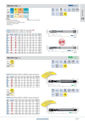 Tap Drills Machine tap Inox Cat. no. PN/mm2 MN/mm2 SN/mm2 NN/mm2135035< 1100 M HSS-E DIN DIN Chamfer form B Metric60°MetricthreadV3coated371376Lfrom M123,5-5 threads < 800 Titanium < 900 135036 < 1200 Nickel < 900vc = m/min. DIN13 6G M 135035 8-12 Through hole 6-8 2-4 135036 6-8 2-4 Design: Use: 13 - for through-hole threads Especially for stainless steels. - chamfer form B, 3.5-5 thread - high-speed steel with vanadium content - vaporised or TiCN coated - tolerance 6G 135035 PRECITOOL, HSSE-V3, vaporised 6G 135036 PRECITOOL, HSSE-V3, TiCN 6G d1mm 135035 135036 Pmm l1 l2 l4mmmmmmd2mm amm l3 Core mmmm M2 0.40 45 8 — 2.8 2.1 5 1.60 M2,5 — 0.45 50 9 — 2.8 2.1 5 2.05 135035 M3 0.50 56 11 18 3.5 2.7 6 2.50 M3,5 — 0.60 56 12 20 4.0 3.0 6 2.90 M4 0.70 63 13 21 4.5 3.4 6 3.30 M5 0.80 70 16 25 6.0 4.9 8 4.20 M6 1.00 80 19 30 6.0 4.9 8 5.00 M8 1.25 90 22 35 8.0 6.2 9 6.80 M10 1.50 100 24 39 10.0 8.0 11 8.50 M12 1.75 110 28 — 9.0 7.0 10 10.20 M14 — 2.00 110 30 — 11.0 9.0 12 12.00 M16 2.00 110 32 — 12.0 9.0 12 14.00 M18 — 2.50 125 34 — 14.0 11.0 14 15.50 M20 2.50 140 34 — 16.0 12.0 15 17.50 135036 Machine tap Inox Cat. no. MN/mm2 M Metric HSS-Co DIN371 Form C Chamfer form C Metric 60°L DIN13 135410 < 1000 thread 35°Twist 2-3 threads vc = m/min. 135410 3-7 6H 2×D M Blind hole 135410 ECOLINE, HSS-Co, RSP35, steam temperedd1mm135410Pmml1l2l4d2a l3 Core mmmmmmmmmmmmmmThe toIfNopOrXgesmnaeecrhlalilneinrg M3 0.50 56 5 18 3.5 2.7 6 2.50 M3,5 0.60 56 6 20 4.0 3.0 6 2.90 M4 0.70 63 7 21 4.5 3.4 6 3.30 M5 0.80 70 8 25 6.0 4.9 8 4.20 M6 1.00 80 10 30 6.0 4.9 8 5.00 M8 1.25 90 13 35 8.0 6.2 9 6.80 M10 1.50 100 15 39 10.0 8.0 11 8.50 Cat. no. MN/mm2 M Metric HSS-Co DIN376 Chamfer form C Metric 60° DINL13 135510 <1000 thread 35°Twist 2-3 threads vc = m/min. 135510 3-7 6H 2×D M Blind hole 135510 ECOLINE, HSS-Co, RSP35, steam tempered d1mm 135510 Pmm l1 l2mmmm d2mm amm l3 Core mmmmM61.008010 4.5 3.46 5.00M81.259013 6.0 4.98 6.80M101.5010015 7.0 5.58 8.50M121.7511018 9.0 7.01010.20The toIfNopOrXgesmnaeecrhlalilneinrg M14 2.00 110 20 11.0 9.0 12 12.00 M16 2.00 110 20 12.0 9.0 12 14.00 M18 2.50 125 25 14.0 11.0 14 15.50 M20 2.50 140 25 16.0 12.0 15 17.50 M22 2.50 140 25 18.0 14.5 17 19.50 M24 3.00 160 30 18.0 14.5 17 21.00 www.precitool.de 13/187