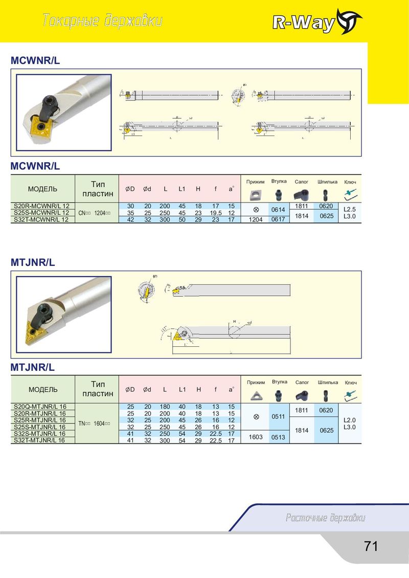 Òîêàðíûå äåðæàâêè MCWNR/L MCWNR/L Тип a。 Прижим Втулка Сапог Шпилька Ключ МОДЕЛЬ пластин D d L L1 H f S20R-MCWNR/L 12 30 20 200 45 18 17 15 0614 1811 0620 L2.5 S25S-MCWNR/L 12 CN□□ 1204□□ 35 25 250 45 23 19.5 12 1814 0625 L3.0 S32T-MCWNR/L 12 42 32 300 50 29 23 17 1204 0617 MTJNR/L MTJNR/L Тип a。 Прижим Втулка Сапог Шпилька Ключ МОДЕЛЬ пластин D d L L1 H f S20Q-MTJNR/L 16 25 20 180 40 18 13 15 1811 0620 S20R-MTJNR/L 16 25 20 200 40 18 13 15 0511 S25R-MTJNR/L 16 TN□□ 1604□□ 32 25 200 45 26 16 12 L2.0 S25S-MTJNR/L 16 32 25 250 45 26 16 12 1814 0625 L3.0 S32S-MTJNR/L 16 41 32 250 54 29 22.5 17 1603 0513 S32T-MTJNR/L 16 41 32 300 54 29 22.5 17 Ðàñòî÷íûå äåðæàâêè 71
