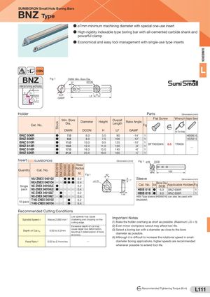 SUMIBORON StockBNC2010 BNC2020 BN1000 BN2000 BN7000 SUMIBORON Small Hole Boring Bars BNZ Type ● ø7mm minimum machining diameter with special one-use insert ● High-rigidity indexable type boring bar with all-cemented carbide shank and powerful clamp ● Economical and easy tool management with single-use type inserts 91° L BNZ Fig 1 DMIN Min. Bore Dia.5° DCON Internal Turning and Facing LF H GAMF Holder Parts Dimensions (mm) Cat. No. Min. BoreDia. Diameter Height OverallLength Rake Angle Fig Flat Screw Wrench Adapter Sleeve Nm DMIN DCON H LF GAMF (For Torx Holes) BNZ 606R ● 7.0 6.0 5.5 80 -14° 1 HBB616 BNZ 608R ● 9.0 8.0 7.5 100 -12° 1 HBB816 BNZ 610RBNZ 612RBNZ 616R ● 11.0 10.0 9.5 125●13.012.011.0130●17.016.015.0145-10°-8°11BFTX0204N0.5 TRX06-6°1 Q BNZ 620R ● 21.0 20.0 19.0 160 -5° 1 Insert ( SUMIBORON) Dimensions (mm) Fig 1 ø16 DCB Nose Quantity Cat. No. Radius 15 100 RE Fig 1 80° NU-ZNEX 040102 Q Q ●●● 0.2NU-ZNEX 040104QQ ●●●0.4ø4.76SingleNC-ZNEX 040102LE●QQQQ0.2Sleeve 7° Dimensions (mm)Cat. No.Stock Bore Dia. DCB Applicable Holders Fig pack NC-ZNEX 040104LE ● Q Q Q Q 0.4 HBB 616 ● 6.0 BNZ 606R 1 NC-ZNEX 040102LT Q ● Q Q Q 0.2 1.59 HBB 816 ● 8.0 BNZ 608R 1 NC-ZNEX 040104LT Q ● Q Q Q 0.4 HBX Type sleeve (HBX6016) can also be used with 10 pack T-NU-ZNEX 040102T-NU-ZNEX 040104QQQQ ●● 0.20.4 BNZ606R. Recommended Cutting Conditions Low speeds may causeSpindle Speed nAbove 2,000 min-1chattering and chipping on theImportant Notes cutting edge. (1) Make the holder overhang as short as possible. (Maximum L/D = 5) Excessive depth of cut may (2) Even minor workpiece runout may affect tool life. Depth of Cut ap 0.03 to 0.2mm cause larger tool deformation,resulting in deterioration of boreaccuracy.(3) Select a boring bar with a diameter as close to the borediameter as possible. (4) Although it is difficult to increase the rotational speed in small- Feed Rate f 0.03 to 0.1mm/rev ― diameter boring applications, higher speeds are recommended whenever possible to extend tool life. N m Recommended Tightening Torque (N·m) L111