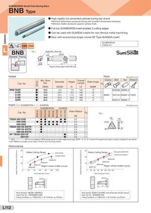 SUMIBORON Holder Shank Diameter DCON (mm) StockBNX10 BNX20 BN2000 BN350 BN500 BN7000 DA150 DA1000 Holder Shank Diameter DCON (mm) SUMIBORON Small Hole Boring Bars BNB Type ● High rigidity full cemented carbide boring bar shank ● Minimal deformation produces boring with excellent dimensional tolerance. ● Minimal chatter produces superior surface finish. ● Full-top SUMIBORON insert enables 3 cutting edges ● Can be used with SUMIDIA inserts for non-ferrous metal machining ● Now with economical single-corner NF Type SUMIDIA insert SUMIBORON 92˚ PCD Clamp-on L BNB Fig 1 DMIN Min. Bore Dia.2° DCON General / Facing H GAMF LF Figure shows right-hand (R) tool. Holder Parts Dimensions (mm) Cat. No. Min. BoreDia. Diameter Height OverallLength ClampRake AngleFigBolt Nut Wrench DMIN DCON H LF GAMF BNB 508R ● 10.0 8.0 7.0 140 -9° 1 BH0306 BNBW-2 510R ● 12.0 10.0 9.0 140 -8° 1 512R ● 14.0 12.0 11.0 160 -6° 1 BNBC FBUP3-A0-9 BNBW-4 TH020 516R ● 18.0 16.0 14.0 180 -5° 1 520R ● 22.0 20.0 18.0 180 -4° 1 BH0310 BNBW-7 Insert ( SUMIBORON / SUMIDIA) Dimensions (mm) SUMIBORON SUMIDIA Cat. No. Nose Radius Fig Fig 1 RE TBGN 060102B ● ● ● ● 0.2 1 60° 1.59 060104B ● ● ● ● ● ● ● ● 0.4 1 ø3.97 5° 060108B ● ● ● ● ● 0.8 1 TBGN 060102-BSTN*1 Q ● Q Q Q Q Q Q 0.2 1 060104-BSTN*1 Q ● Q Q Q Q Q Q 0.4 1 RE 5° 060108-BSTN*1 Q ● Q Q Q Q Q Q 0.8 1 NF-TBGN 060102*2 Q Q Q Q Q Q Q ● 0.2 1 060104*2 Q Q Q Q Q Q Q ● 0.4 1 *1 T BGN ○○○○○○ -BSTN is only available in BNX20 grade and has a smaller negative land angle. (BSTN: -15°, B: -25°. However, the negative land angle is uniquely configured for each grade.) *2 NF-TBGN is a single corner insert. (This is not a Full-Top insert) Performance 30 30 Stable Cutting Range ● Steel Shank Stable Cutting Range ● Interrupted (SCM415) Continuous (SKD61) 20 ● ● Carbide Shank 20 ●● ● BNB520R ● BNB525R 10 ● BNB516R ● ● BNB520R10 ● BNB512R Region where chatter occursBNB508R BNB516R Region where chatter occursBNB512R 0 20 40 60 80 100 120 0 20 40 60 80 100 120 140 Tool Overhang L (mm) Tool Overhang L (mm) DCON DCON L L Work Material: SKD61 (60HRC) Work Material: SCM415 (61HRC) Internal Diameter ø45 (6U Groove) Insert Cat. No.: TBGN060104B Insert Cat. No.: TBGN060104B Cutting Conditions: vc=100m/min, f =0.1mm/rev, ap=0.2mm Cutting Conditions: vc=100m/min, f =0.1mm/rev, ap=0.2mm L112