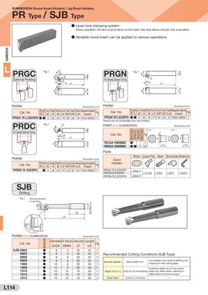 SUMIBORON 45° 45° DMIN5° BN250 WFHFWFHF 30° BHBH DCON-00.015 BN2000 BNX20 BN350 WFHFBN7000 ø9 7° ø8.4 BH ø9 SUMIBORON Round Insert Holders / Jig Borer Holders PR Type / SJB Type ● Lever lock clamping system ● Easy operation; the lack of protrusions on the insert rake face allows smooth chip evacuation. ● Versatile round insert can be applied to various operations. L PRGC Fig 1 15° PRGN Fig 1 External Profiling For General External Turning IC LH IC LF LH LF 7° Holder Dimensions (mm) Holder Dimensions (mm) Cat. No. Stock R L InscribedCircle IC Height H Width B OveralLength LF CutingEdge WF EdgeHeight HF Head LH Applicable Insert Fig Cat. No. Stock R L InscribedCircle IC Height H Width B Overal Length LF CutingEdge WF EdgeHeight HF Head LH Applicable Insert Fig PRGC R/L3225P9 ● ● 9 32 25 170 32 32 18 RCGA 0906M0 1 PRGN R/L3225P9 ●● 9 32 25 170 32 32 10 RNGA 0906M0 1 Inserts are not embedded into tool holders. PRDC Fig 1 IC Insert ( SUMIBORON) Dimensions (mm) Fig 1 Fig 2 For General External Turning LH Cat. No. Fig 15° LF RCGA 0906M0 ● 1 RNGA 0906M0 ●● 2 6.35 6.35 Parts Holder Shim Lever Pin Bolt Shim Set Screw WrenchDimensions (mm)Good Cat. No. Stock R L InscribedCircle IC Height H Width B OveralLength LF CutingEdge WF EdgeHeight HF Head LH Applicable Insert Fig Holders PRDC N 3225P9 ● 9 32 25 170 12.5 32 25 RCGA 0906M0 1 PRGC R/L3225P9PRDCN 3225P9 LSR817 LCL3S LCS3 LSP3 LH025 PRGN R/L3225P9 LSR917 SJB Drilling Fig 1 Grinding direction of rake face LS LF 0.4 to 0.5 Holder ( SUMIBORON) Dimensions (mm) Diameter Min. Bore Dia. Overall Length Length Cat. No. Fig DCON DMIN LF LS SJB 0804 ● 8 4 45 32 1 SJB 0805 ● 8 5 45 32 1 Recommended Cutting Conditions (SJB Type) SJB 0806 ● 8 6 50 30 1 SJB 0808SJB 1006 ● 8●10 86 6050 30 1301 Spindle Speed n Above 800 min-1 Low speeds may cause chattering andchipping on the cutting edge. SJB 1008 ● 10 8 60 30 1 Excessive depth of cut may cause SJB 1010 ● 10 10 70 30 1 Depth of Cut ap 0.03 to 0.3 mm/radius larger tool deformation, resulting in SJB 1012 ● 10 12 70 30 1 deterioration of bore accuracy. SJB 1015 ● 10 15 70 30 1 Feed Rate f 0.03 to 0.1mm/rev — L114