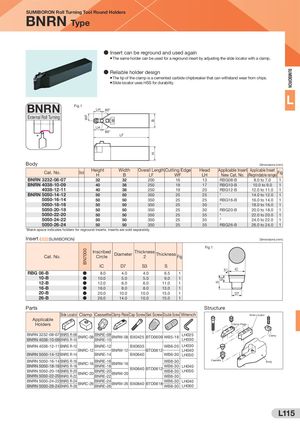 SUMIBORON WFBN7000 BH S S3 SUMIBORON Roll Turning Tool Round Holders BNRN Type ● Insert can be reground and used again ● The same holder can be used for a reground insert by adjusting the slide locator with a clamp. ● Reliable holder design ● The tip of the clamp is a cemented carbide chipbreaker that can withstand wear from chips. ● Slide locator uses HSS for durability. L BNRN Fig 1 LH 60° External Roll Turning LH 60° LF Body Dimensions (mm) Cat. No. Stock HeightH WidthB Overall Length Cutting EdgeLFWF HeadLH Applicable New Cat.Insert No. Applicable Insert (Regrindable range) Fig BNRN 3232-08-07 32 32 200 16 13 RBG08-B 8.0 to 7.0 1 BNRN 4038-10-09 40 38 250 19 17 RBG10-B 10.0 to 9.0 1 BNRN 4038-12-11 40 38 250 19 20 RBG12-B 12.0 to 11.0 1 BNRN 5050-14-12 50 50 350 25 25 * 14.0 to 12.0 1 BNRN 5050-16-14 50 50 350 25 25 RBG16-B 16.0 to 14.0 1 BNRN 5050-18-16 50 50 350 25 30 * 18.0 to 16.0 1 BNRN 5050-20-18 50 50 350 25 30 RBG20-B 20.0 to 18.0 1 BNRN 5050-22-20 50 50 350 25 35 * 22.0 to 20.0 1 BNRN 5050-24-22 50 50 350 25 35 * 24.0 to 22.0 1 BNRN 5050-26-24 50 50 350 25 35 RBG26-B 26.0 to 24.0 1 *Blank space indicates holders for reground inserts. Inserts are sold separately. Insert ( SUMIBORON) Dimensions (mm) Fig 1 Cat. No. InscribedCircleDiameterThickness 2 Thickness Fig IC D7 S3 S 5° IC RBG 08-B ● 8.0 4.0 4.0 6.5 1 RBG 10-B ● 10.0 5.0 5.0 9.0 1 RBG 12-B ● 12.0 6.0 6.0 11.0 1 RBG 16-B ● 16.0 8.0 8.0 13.0 1 RBG 20-B ● 20.0 10.0 10.0 15.0 1 D7 RBG 26-B ● 26.0 14.0 10.0 15.0 1 Parts Structure Slide Locator Clamp Cassette Clamp Plate Cap Screw Set Screw Double Screw Wrench Slide Locator Applicable Holders Clamp Plate BNRN BNRN 3232-08-07 4038-10-09 BNRS BNRS R-08 R-10 BNRC-08 BNRE-08 BNRE-10 BNRW-08 BX0425 BTD0609 WB5-18 LH025LH030 Clamp BNRN 4038-12-11 BNRS R-12 BNRE-12 BX0635 WB6-20 LH030 BNRC-12 BNRW-12 BTD0812 LH040 BNRN 5050-14-12 BNRS R-14 BNRE-14 BX0640 WB6-30 LH050 BNRN BNRN 5050-16-14 5050-18-16 BNRS BNRS R-16 R-18 BNRC-16 BNRN BNRN 5050-20-18 5050-22-20 BNRS BNRS R-20 R-22 BNRC-20 BNRE-16 BNRE-18 BNRW-16 BNRE-20 BNRE-22 BNRW-20 BX0640 BTD0812 WB8-30 WB6-30 WB8-30 WB6-30 LH040LH050 Cassette Body BNRN BNRN 5050-24-22 5050-26-24 BNRS BNRS R-24 R-26 BNRC-26 BNRE-24 BNRE-26 BNRW-26 BX0840 BTD0818 WB6-30 WB8-30 LH040LH060 L115