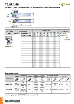 TDJNR/L-TB Державка Т-типа с наконечником для подачи СОЖ под высоким давлением LH LH HF H HBH G 1/8H G 1/8 F1 WF B 93° B LF TDJNR-TB 3° LF Угол в плане Обозначение Размеры (мм)HHFBLFLHWF HBH F1 Пластина 93° TDJNR/L 2020 K1305-TB 20 20 20 125 41 25 7 29 DN... 1305… 2525 M1305-TB 25 25 25 150 41 32 7 32 27° max. A260-A265 27° max. Комплектующие Обозначение Прижим ЗажимнойвинтПружина Верхнее Нижнееуплотнительное уплотнительноекольцокольцоОпорнаяпластинаВинт опорнойпластиныКлюч ...2020-TB DLM 3.5-NX-TB BHM5x0.8x21-MO-TBDSP 4O-RINGID5.28x1.78O-RINGID7.59x2.62LSD 3.52SO 50090I-MOL-W 3 T 20 ...2525-TB DLM 3.5-NX-TB BHM5x0.8x21-MO-TBDSP 4O-RING O-RINGID5.28xID7.59xLSD 3.52SO 50090I L-W 31.782.62T 20 TaeguTec Industry 4.0 Комплектующие для COOL-BURST указаны на стр. A160 TaeguTec Industry 4.0 A 114 TaeguTec Industry 4.0