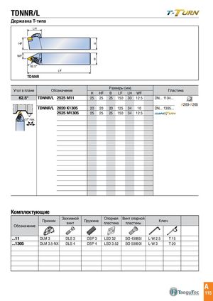 TDNNR/L Державка Т-типа LH H HF H B WF LF B 62.5° LF TDNNR Угол в плане Обозначение Размеры (мм)HHFBLFLHWF Пластина 62.5° TDNNR/L 2525 M11 25 25 25 150 30 12.5 DN... 1104... A260-A265 TDNNR/L 2020 K1305 20 20 20 125 34 10 DN... 1305... 2525 M1305 25 25 25 150 34 12.5 57° max. 57° max. Комплектующие Обозначение Прижим Зажимнойвинт Пружина Опорная Винт опорнойпластинапластиныКлюч ...11 DLM 3 DLS 3 DSP 3 LSD 32 SO 40085I L-W 2.5 T 15 ...1305 DLM 3.5-NX DLS 4 DSP 4 LSD 3.52 SO 50090I L-W 3 T 20 A 115