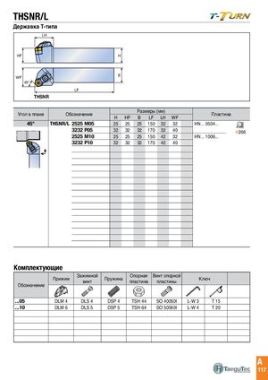 THSNR/L Державка Т-типа LH HF H H WF B B 45° LF LF THSNR Угол в плане Обозначение Размеры (мм)HHFBLFLHWF Пластина 45° THSNR/L 2525 M05 25 25 25 150 32 32 HN... 0504... 3232 P05 32 32 32 170 32 40 A266 2525 M10 25 25 25 150 42 32 HN... 1006... 3232 P10 32 32 32 170 42 40 Комплектующие Обозначение Прижим Зажимнойвинт Пружина Опорная Винт опорнойпластинапластиныКлюч ...05 DLM 4 DLS 4 DSP 4 TSH 44 SO 40050I L-W 3 T 15 ...10 DLM 6 DLS 5 DSP 5 TSH 64 SO 50090I L-W 4 T 20 A 117