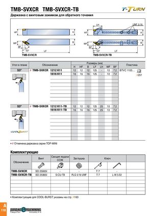 TMB-SVXCR TMB-SVXCR-TB Державка с винтовым зажимом для обратного точения LH UNF 5/16 HF H H HF H WF B B WF B BF BF ° LF 53° LF 53° LF TMB-SVXCR TMB-SVXCR-TB Угол в плане Обозначение Размеры (мм)HHFBLFLHWF BF Пластина 53° # TMB-SVXCR 1212 K11 12 12 12 125 - 10 7.2 BTVC 1103… 1616 K11 16 16 16 125 - 10 7.2 A291 Top coolant Bottom coolant 53° # TMB-SVXCR 1212 K11-TB 12 12 12 125 25 10 7.2 1616 K11-TB 16 16 16 125 25 10 7.2 # Отмечена державка серии TOP-MINI Комплектующие Обозначение Винт Секция подачиСОЖ Заглушка Ключ TMB-SVXCR SO 25065I - - T7 - TMB-SVXCR-TB SO 25065I S-CU-TB PLG 5/16 UNF T7 L-W 5/32 TaeguTec Industry 4.0 Комплектующие для COOL-BURST указаны на стр. A160 TaeguTec Industry 4.0 A 118 TaeguTec Industry 4.0