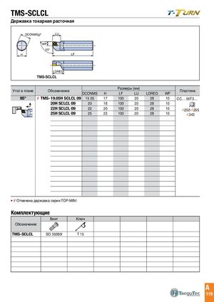 TMS-SCLCL Державка токарная расточная DCONToMpScgo7olantDCONMSg7LULU Bottom WcoFolant WF 95° HH 95° LFLF LDRED TMS-SCLCLLDRED Угол в плане Обозначение DCONMS H Размеры (мм)LFLULDRED WF Пластина 95° # TMS-19.05H SCLCL 09 19.05 17 100 20 28 10 CC… 09T3… 20H SCLCL 09 20 18 100 20 28 10 22H SCLCL 09 22 20 100 20 28 10 A292-A295 25H SCLCL 09 25 23 100 20 28 10 A343 # Отмечена державка серии TOP-MINI Комплектующие Винт Ключ Обозначение TMS-SCLCL SO 35080I T 15 A 119