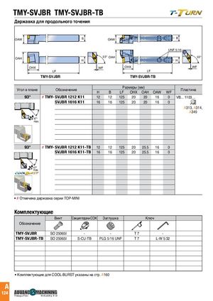 TMY-SVJBR TMY-SVJBR-TB Державка для продольного точения OAW B B OAW OAW B OAW CoolaBnt14m7a°x.OAW4m7a°x. CoolaBnt1 4m7a°x.B Coolant2 CoCoolaonlat2nt1 UNF 5/16 4m7a°x. UNF 5/16 OAH H OAH 93° OAH 93° CoUoNlaFnt52/16 93°HHHOAH LF OAH OHX LF OHX WFHLF OHX WF93° H WFOHXLF OHX TMY-SVJBR TMY-SVJBWLRFF-TB LF Угол в плане Обозначение H B Размеры (мм)LFOHXOAH OAW WF Пластина 93° # TMY- SVJBR 1212 K11 12 12 125 20 20 16 0 VB... 1103… SVJBR 1616 K11 16 16 125 20 20 16 0 A313, A314, A349 Coolant1 4m7a°x. Coolant2 93° 93° # TMY- SVJBR 1212 K11-TB 12 12 125 20 25.5 16 0 WF SVJBR 1616 K11-TB 16 16 125 20 25.5 16 0 4m7a°x. 93° # Отмечена державка серии TOP-MINI WF Комплектующие Винт Секция подачи СОЖ Заглушка Ключ Обозначение TMY-SVJBR SO 25065I - - T7 - TMY-SVJBR-TB SO 25065I S-CU-TB PLG 5/16 UNF T7 L-W 5/32 TaeguTec Industry 4.0 Комплектующие для COOL-BURST указаны на стр. A160 TaeguTec Industry 4.0 A 124 TaeguTec Industry 4.0