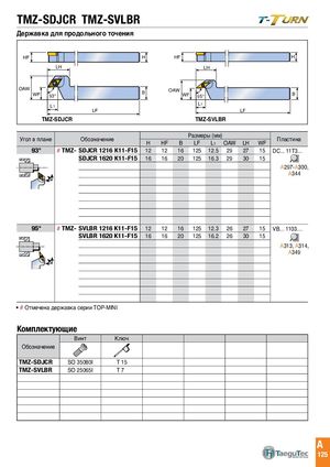 TMZ-SDJCR TMZ-SVLBR Державка для продольного точения HFHF H HFHHF HH LH LH LH LH OAWOAWWF 93°WF9L31°L1 LFTMZ-SDJCRLF BB OAWOAW WFWF 95°L951 °L1 LFTMZ-SVLBRLF BB Угол в плане Обозначение H HF Размеры (мм)BLFL1 OAW LH WF Пластина 93° # TMZ- SDJCR 1216 K11-F15 12 12 16 125 12.5 29 27 15 DC... 11T3... SDJCR 1620 K11-F15 16 16 20 125 16.3 29 30 15 A297-A300, A344 95° # TMZ- SVLBR 1216 K11-F15 12 12 16 125 12.3 26 27 15 VB... 1103… SVLBR 1620 K11-F15 16 16 20 125 16.2 26 30 15 A313, A314, A349 # Отмечена державка серии TOP-MINI Комплектующие Винт Ключ Обозначение TMZ-SDJCR SO 35080I T 15 TMZ-SVLBR SO 25065I T7 A 125