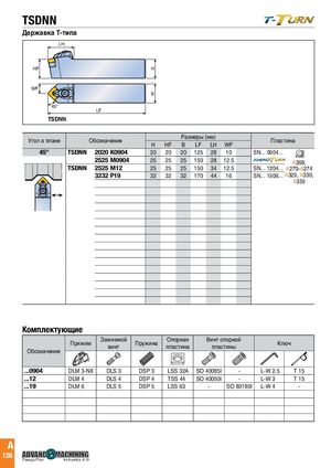 TSDNN Державка Т-типа LH LH HF H H WF B B 45° LF45° LF TSDNN Угол в плане Обозначение Размеры (мм)HHFBLFLHWF Пластина 45° TSDNN 2020 K0904 20 20 20 125 28 10 SN... 0904... 2525 M0904 25 25 25 150 28 12.5 A268, TSDNN 2525 M12 25 25 25 150 34 12.5 SN... 1204... A270-A274 3232 P19 32 32 32 170 44 16 SN... 1906... A329, A330, A339 Комплектующие Обозначение Прижим Зажимнойвинт Пружина ОпорнаяпластинаВинт опорнойпластины Ключ ...0904 DLM 3-NX DLS 3 DSP 3 LSS 32A SO 40085I - L-W 2.5 T 15 ...12 DLM 4 DLS 4 DSP 4 TSS 44 SO 40050I - L-W 3 T 15 ...19 DLM 6 DLS 5 DSP 5 LSS 63 - SO 80180I L-W 4 - TaeguTec Industry 4.0 TaeguTec Industry 4.0 A 126 TaeguTec Industry 4.0