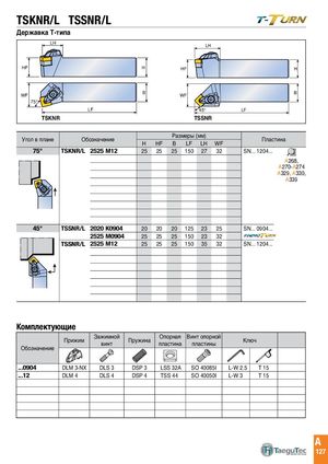 LH TSKNR/L TSSNR/L Державка Т-типа H LH LH B 75° HF H HF H LF WF B WF B LH 75° LF 45° LF TSKNR TSSNR H Угол в плане Обозначение Размеры (мм)HHFBLFLH WF Пластина 75° TSKNR/L 2B525 M12 25 25 25 150 27 32 SN... 1204... A268, ° LF A270-A274A329, A330, A339 45° TSSNR/L 2020 K0904 20 20 20 125 23 25 SN... 0904... 2525 M0904 25 25 25 150 23 32 TSSNR/L 2525 M12 25 25 25 150 35 32 SN... 1204... Комплектующие Обозначение Прижим ЗажимнойвинтПружина Опорная Винт опорнойпластинапластиныКлюч ...0904 DLM 3-NX DLS 3 DSP 3 LSS 32A SO 40085I L-W 2.5 T 15 ...12 DLM 4 DLS 4 DSP 4 TSS 44 SO 40050I L-W 3 T 15 A 127