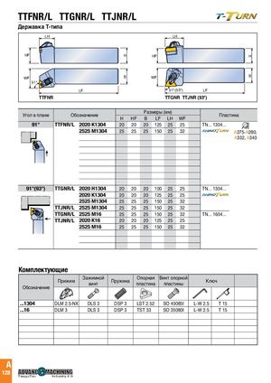 LH TTFNR/L TTGNR/L TTJNR/L Державка Т-типа LH H LH HF B H HF H LF WF B WF B 91° LH LF 91° (93°) LF TTFNR TTGNR TTJNR (93°) Угол в плане ОбозначHение Размеры (мм)HHFBLFLH WF Пластина 91° TTFNR/L 2020 K1304 20 20 20 125 25 25 TN... 1304... 252B5 M1304 25 25 25 150 25 32 A275-A280, A332, A340 91° (93°) LF 91°(93°) TTGNR/L 2020 H1304 20 20 20 100 25 25 TN... 1304... 2020 K1304 20 20 20 125 25 25 2525 M1304 25 25 25 150 25 32 TTJNR/L 2525 M1304 25 25 25 150 25 32 TTGNR/L 2525 M16 25 25 25 150 25 32 TN... 1604... TTJNR/L 2020 K16 20 20 20 125 25 25 2525 M16 25 25 25 150 25 32 Комплектующие Обозначение Прижим ЗажимнойвинтПружина Опорная Винт опорнойпластинапластиныКлюч ...1304 DLM 2.5-NX DLS 3 DSP 3 LST 2.52 SO 40085I L-W 2.5 T 15 ...16 DLM 3 DLS 3 DSP 3 TST 33 SO 35080I L-W 2.5 T 15 TaeguTec Industry 4.0 TaeguTec Industry 4.0 A 128 TaeguTec Industry 4.0