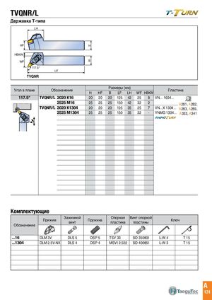 TVQNR/L Державка Т-типа LH HF H HBKW h WF B 117.5°b LF TVQNR l1 Угол в плане Обозначение Размеры (мм)HHFBLFLHWFHBKW Пластина 117.5° TVQNR/L 2020 K16 20 20 20 125 42 25 8 VN... 1604... 2525 M16TVQNR/L 2020 K130425 25 25 150 42 32 2 A281, A282,20202012535257VN...X 1304...A283, A289, 2525 M1304 25 25 25 150 35 32 - YNMG 1304... A333, A341 Комплектующие Обозначение Прижим Зажимнойвинт Пружина Опорная Винт опорнойпластинапластиныКлюч ...16 DLM 3V DLS 5 DSP 5 TSV 33 SO 35080I L-W 4 T 15 ...1304 DLM 2.5V-NX DLS 4 DSP 4 MSVI 2.522 SO 40085I L-W 3 T 15 A 131