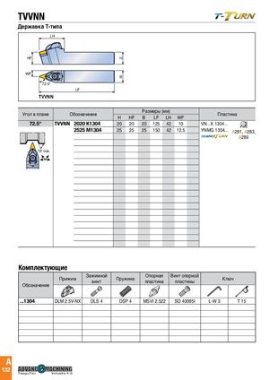 TVVNN Державка Т-типа LH LH H HF H WF72.5° B B L7F2.5° LF TVVNN Угол в плане Обозначение Размеры (мм)HHFBLFLHWF Пластина 72.5° TVVNN 2020 K1304 20 20 20 125 42 10 VN...X 1304... 2525 M1304 25 25 25 150 42 12.5 YNMG 1304... A281, A283, A289 70° max. 70° max. Комплектующие Обозначение Прижим Зажимнойвинт Пружина Опорная Винт опорнойпластинапластиныКлюч ...1304 DLM 2.5V-NX DLS 4 DSP 4 MSVI 2.522 SO 40085I L-W 3 T 15 TaeguTec Industry 4.0 TaeguTec Industry 4.0 A 132 TaeguTec Industry 4.0