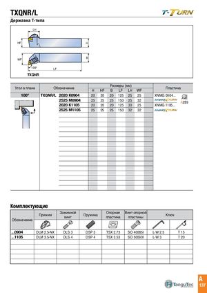 TXQNR/L Державка Т-типа LH H HF H WF H B 100° LF TXQNR B 0° LFУгол в плане Обозначение Размеры (мм)HHFBLFLHWF Пластина 100° TXQNR/L 2020 K0904 20 20 20 125 25 25 XNMG 0904... 2525 M0904 25 25 25 150 25 322020 K11052020201253025XNMG 1105...A289 2525 M1105 25 25 25 150 32 32 Комплектующие ПрижимОбозначениеЗажимнойвинтПружина Опорная Винт опорнойпластинапластиныКлюч ...0904 DLM 2.5-NX DLS 3 DSP 3 TSX 2.73 SO 40085I L-W 2.5 T 15 ...1105 DLM 3.5-NX DLS 4 DSP 4 TSX 3.53 SO 50090I L-W 3 T 20 A 137