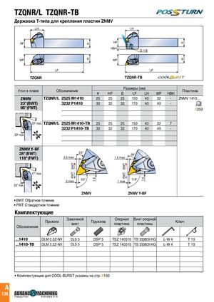 BWTFWT BWTFWT 1.5 1.5 BWTB FWTWTFWT BWTFWT BWTFWT 1.51.5 1.5 1.5 BWTB FWTWTFWT 1.51.5 FWT BWT TZQNR/L TZQNR-TB Державка Т-типа для крепления пластин ZNMV LH LH LHHF H HF 23° 28° H 2.5 max. 2.5HmBaHx. 1.5 max.G 1/8 HF H 23° 28° WF B 2.5 WmaFx. 1.5 max. B 2 max. WF LF B 2 max. 95° LF 1 max. 118° TZQNR TZQNR-TB LF 2 max. 95° 1 max. 118° LH Угол в плане Обозначение H HF Размеры (мм)BLF LH WF HBH Пластина ZNMV TZQNR/L 2525 M1410 25 25 25 150 40 32 - ZNMV 1410… 23°(BWT)95°(FWT)20° max. H 3232 P1410 23° 32 32 32 170 4028° 40 -17°2m.5axm. ax.1.5 max.A290 20° max. 17° max. 20° max. 20° max. TZQ2N5B°Rm/aLx. 252517M° m1ax4. 10-TB 25 25 25 150 40 32 7 LF20° max. 3232 P1410-TB 3225° max.2 max.95°32 32 1701 max. 118°4020° max4. 0 - 25° max. ZNMV Y-BF 28°(BWT) HH 2233°°118°(FWT)22..55 mmaaxx..11..55 mmaaxx.. 2288°° BB max. 17° max. LLFF 22 mmaaxx.. 9955°° 11 mmaaxx.. 111188°° 25° max. ZNMV ZNMV Y-BF BWT: Обратное точение FWT: Стандартное точение Комплектующие 1177°° mmaaxx.. ПрижимОбозначение Зажимнойвинт Пружина Опорная Винт опорнойпластинапластины Ключ 2255°° mmaaxx.. ...1410 DLM 3.3Z-NV DLS 5 DSP 5 TSZ 140310 TS 35083I/HG L-W 4 T 10 ...1410-TB DLM 3.3Z-NV DLS 5 DSP 5 TSZ 140310 TS 35083I/HG L-W 4 T 10 TaeguTec Industry 4.0 Комплектующие для COOL-BURST указаны на стр. A160 TaeguTec Industry 4.0 A 138 TaeguTec Industry 4.0