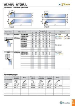 WTJNR/L WTQNR/L Державка с клиновым прижимом LH LH HF H H HF H BWF B WF B LF 93° LF 105° LF WTJNR WTQNR H Угол в плане ОбозначениеH Размеры (мм)HHFBLFLHWF Пластина 93° WTJNR/L 2020 K1304 20 20 20 125 27 25 TN... 1304... 2525 M1304 25 25 25 150 27 32 A275-A280, WTJNR/LB 2020 K16 20 20 20 125 32 25 TN... 1604... A332, A340 2525 M16 25 25 25 150 32 32 5° LF 3225 P16 32 32 25 170 32 323232 P163232321703840 2525 M22 25 25 25 150 38 32 TN... 2204... 3232 P22 32 32 32 170 38 40 105° WTQNR/L 2020 K1304 20 20 20 125 27 25 TN... 1304... 2525 M1304 25 25 25 150 27 32 Комплектующие КлиновойОбозначениеприжимВинтУпорное Опорная ВинтовойкольцопластинастерженьКлюч ...1304 WC 2.53 WCS 2.5 CSR 2 WST 2.52 WSS 2.52 L-W 2.5 ...16 WC 33 WCS 4 WSR 4 WST 33 WSS 33 L-W 3, L-W 2.5 ...22 WC 43 WCS 4 WSR 4 WST 43 WSS 43 L-W 3 A 141