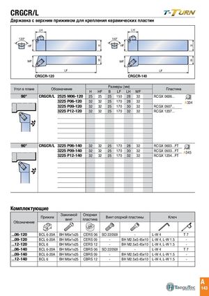 LH CRGCR/L Державка с верхним прижимом для крепления керамических пластин LH H LH 120° 140° HF B H HF H LF WFH B WF B LF LF CRGCR-120 CRGCR-140 H Угол в плане Обозначение Размеры (мм)HHFBLFLHWF Пластина 90° CRGCR/L B2525 M06-120 25 25 25 150 28 32 RCGX 0606... LF 3225 P06-120 32 32 25 170 28 32 A3343225 P09-1203232251703032RCGX 0907... 3225 P12-120 32 32 25 170 32 32 RCGX 1207... 90° CRGCR/L 3225 P06-140 32 32 25 170 28 32 RCGX 0603...FT 3225 P09-140 32 32 25 170 30 323225 P12-1403232251703232RCGX 0903...FTA345RCGX 1204...FT Комплектующие Обозначение Прижим Зажимной ОпорнаявинтпластинаВинт опорной пластины Ключ ...06-120 BCL 6-20A BH M6x1x25 CERS 06 SO 22050I - L-W 4 T7 ...09-120 BCL 6-20A BH M6x1x25 CERS 09 - BH M2.5x0.45x10 L-W 4, L-W 1.5 - ...12-120 BCL 6 BH M6x1x25 CERS 12 - BH M2.5x0.45x10 L-W 4, L-W 1.5 - ...06-140 BCL 6-20A BH M6x1x25 CBRS 06 SO 22050I - L-W 4 T7 ...09-140 BCL 6-20A BH M6x1x25 CBRS 09 - BH M2.5x0.45x10 L-W 4, L-W 1.5 - ...12-140 BCL 6 BH M6x1x25 CBRS 12 - BH M2.5x0.45x10 L-W 4, L-W 1.5 - A 143