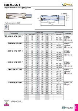 TDR 25...CA-T Сверло со сменными картриджами DCONMSh6 DC DF LU • Глубина сверления: 2.5xD LPR LS OAL Обозначение Размеры (мм)DCDCONMSDFLU LPR УстановочнаяLSпластинаПластина TDR 2551-53-50T2-07CA-T 51 50 75 133 170 80 - SPMG 07... 52 50 75 133 170 80 TDP-0701 DG/DK/DA 53 50 75 133 170 80 TDP-0702 D148-149 2554-56-50T2-07CA-T 54 50 75 140 180 80 - SPMG 07... 55 50 75 140 180 80 TDP-0701 DG/DK/DA 56 50 75 140 180 80 TDP-0702 D148-149 2557-62-50T2-09CA-T 57 50 75 155 201 80 - SPMG 09... 58 50 75 155 201 80 TDP-0901 DG/DK/DA 59 50 75 155 201 80 TDP-0902 D148-149 60 50 75 155 201 80 TDP-0903 61 50 75 155 201 80 TDP-0904 62 50 75 155 201 80 TDP-0905 2563-66-50T2-09CA-T 63 50 75 165 215 80 - SPMG 09... 64 50 75 165 215 80 TDP-0901 DG/DK/DA 65 50 75 165 215 80 TDP-0902 D148-149 66 50 75 165 215 80 TDP-0903 2567-73-50T2-11CA-T 67 50 75 183 240 80 - SPMG 11... 68 50 75 183 240 80 TDP-1101 DG/DK/DA 69 50 75 183 240 80 TDP-1102 D148-149 70 50 75 183 240 80 TDP-1103 71 50 75 183 240 80 TDP-1104 72 50 75 183 240 80 TDP-1105 73 50 75 183 240 80 TDP-1106 2574-80-50T2-12CA-T 74 50 75 200 250 80 - SPMG 12...DG 75 50 75 200 250 80 TDP-1101 D148 76 50 75 200 250 80 TDP-1102 77 50 75 200 250 80 TDP-1103 78 50 75 200 250 80 TDP-1104 79 50 75 200 250 80 TDP-1105 80 50 75 200 250 80 TDP-1106 Уреслзаонвиияя • OAL = LPR+LS D184 D 45