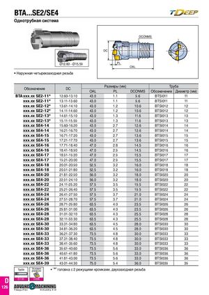 BTA...SE2/SE4 Однотрубная система DCONMS DC Ø12.60 - Ø15.59 PL OAL • Наружная четырехзаходная резьба Обозначение DC Размеры (мм) ТрубаOALPLDCONMSОбозначениеДиаметр (мм) BTA xxx.xx SE2-11* 12.60-13.10 43.0 1.1 9.6 BTSI011 11 xxx.xx SE2-11* 13.11-13.60 43.0 1.1 9.6 BTSI011 11 xxx.xx SE2-12* 13.61-14.10 43.0 1.2 10.6 BTSI012 12 xxx.xx SE2-12* 14.11-14.60 43.0 1.2 10.6 BTSI012 12 xxx.xx SE2-13* 14.61-15.10 43.0 1.3 11.6 BTSI013 13 xxx.xx SE2-13* 15.11-15.59 43.0 1.3 11.6 BTSI013 13 xxx.xx SE4-14 15.60-16.20 43.0 2.7 12.6 BTSI014 14 xxx.xx SE4-14 16.21-16.70 43.0 2.7 12.6 BTSI014 14 xxx.xx SE4-15 16.71-17.20 43.0 2.7 13.6 BTSI015 15 xxx.xx SE4-15 17.21-17.70 43.0 2.7 13.6 BTSI015 15 xxx.xx SE4-16 17.71-18.40 47.0 2.8 14.5 BTSI016 16 xxx.xx SE4-16 18.41-18.90 47.0 2.9 14.5 BTSI016 16 xxx.xx SE4-17 18.91-19.20 47.0 2.9 15.5 BTSI017 17 xxx.xx SE4-17 19.21-20.00 47.0 2.9 15.5 BTSI017 17 xxx.xx SE4-18 20.01-20.90 52.5 3.2 16.0 BTSI018 18 xxx.xx SE4-18 20.91-21.80 52.5 3.2 16.0 BTSI018 18 xxx.xx SE4-20 21.81-22.90 56.0 3.2 18.0 BTSI020 20 xxx.xx SE4-20 22.91-24.10 56.0 3.2 18.0 BTSI020 20 xxx.xx SE4-22 24.11-25.20 57.5 3.5 19.5 BTSI022 22 xxx.xx SE4-22 25.21-26.40 57.5 3.5 19.5 BTSI022 22 xxx.xx SE4-24 26.41-27.50 57.5 3.7 21.0 BTSI024 24 xxx.xx SE4-24 27.51-28.70 57.5 3.7 21.0 BTSI024 24 xxx.xx SE4-26 28.71-29.80 63.5 4.0 23.5 BTSI026 26 xxx.xx SE4-26 29.81-31.00 63.5 4.0 23.5 BTSI026 26 xxx.xx SE4-28 31.01-32.10 63.5 4.3 25.5 BTSI028 28 xxx.xx SE4-28 32.11-33.30 63.5 4.3 25.5 BTSI028 28 xxx.xx SE4-30 33.31-34.80 63.5 4.5 28.0 BTSI030 30 xxx.xx SE4-30 34.81-36.20 63.5 4.5 28.0 BTSI030 30 xxx.xx SE4-33 36.21-37.30 73.5 4.8 30.0 BTSI033 33 xxx.xx SE4-33 37.31-38.40 73.5 4.8 30.0 BTSI033 33 xxx.xx SE4-33 38.41-39.60 73.5 4.8 30.0 BTSI033 33 xxx.xx SE4-36 39.61-40.60 73.5 5.6 33.0 BTSI036 36 xxx.xx SE4-36 40.61-41.80 73.5 5.6 33.0 BTSI036 36 xxx.xx SE4-36 41.81-43.00 73.5 5.6 33.0 BTSI036 36 '⁎' TaeguTxexcx.xx SEI4nd-u3s9try 4.0 Труба Уреслзаонвиияя • 43.01-44.30 75.0 головка с 2 режущими кромками, 5.4 двухзаходная 36.0 резьба BTSI039 39 TaeguTec Industry 4.0 D D130 D206 126 TaeguTec Industry 4.0