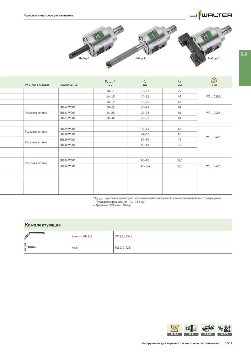 Черновое и чистовое растачивание B2 Набор 1 Набор 2 Набор 3 Dc опт.* Dc LC Резцовая вставка Обозначение мм мм мм Тип 10–11 10–17 27 14–15 14–21 47 WC . . 0302 . . 18–19 18–25 65 EB644.WC04 20–22 20–24 81 Резцовая вставка EB621.WC04 24–26 24–28 81 WC . . 0402 . . EB623.WC04 28–30 28–32 81 EB629.WC04 32–41 63 Резцовая вставка EB630.WC04 41–50 63 WC . . 0402 . . EB629.WC04 50–59 72 Резцовая вставка EB630.WC04 59–68 72 EB634.WC04 68–96 32,5 Резцовая вставка EB634.WC04 96–124 32,5 WC . . 0402 . . * Dc опт. = диапазон диаметров с оптимальной балансировкой, для максимальной частоты вращения. – Регулировка радиальная –0,1/+3,5 мм – Давление СОЖ макс. 40 бар Комплектующие Ключ по DIN 911 SW 1,5 / SW 3 Ключ FS1174 (T25) B 506 D1 B 640 B 626 Инструменты для чернового и чистового растачивания B 583