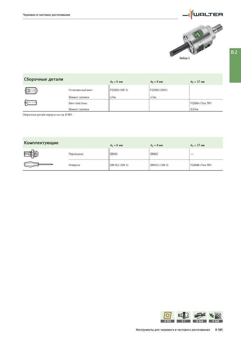 Черновое и чистовое растачивание B2 Набор 1 Сборочные детали d5 = 6 мм d5 = 8 мм d5 = 17 мм Установочный винт FS2093 (SW 3) FS2093 (SW3) Момент затяжки 4 Нм 4 Нм Винт пластины FS2084 (Torx 7IP) Момент затяжки 0,9 Нм Сборочные детали корпуса на стр. B 587. Комплектующие d1 = 6 мм d1 = 8 мм d1 = 17 мм Переходник EB601 EB602 — Отвёртка DIN 911 (SW 3) DIN 911 (SW 3) FS2088 (Torx 7IP) B 510 D1 B 640 B 626 Инструменты для чернового и чистового растачивания B 585