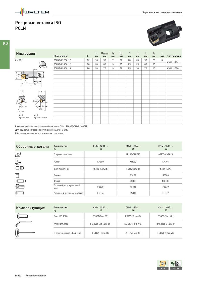 Черновое и чистовое растачивание Резцовые вставки ISO PCLN B2 Инструмент b Dc мин. d8 l13 f h l1 l5 t Обозначение h1 мм мм мм мм мм мм мм мм мм Тип пластин κ = 95° PCLNR/L12CA-12 12 16 50 7 20 20 20 55 28 6 f CNM . 1204 . . PCLNR/L16CA-12 16 20 60 9 25 25 25 63 35 l1 PCLNR/L20CA-16 20 20 70 9 30 25 30 70 40 CNM . 1606 . . A f 95˚ b B 95˚ l13 l5 l1 h h t d8 d8 Dcmin Dcmin h1 h1 45˚ 20˚ A–B A–B h1 = 12 mm h1 = 16–20 mm Размеры указаны для эталонной пластины CNM . 120408/CNM . 160612. Для радиальной/осевой регулировки см. стр. B 645. Сборочные детали входят в комплект поставки. Сборочные детали Тип пластин CNM . 1204 . . CNM . 1204 . . CNM . 1606 . . h1 12 16 20 Опорная пластина AP134-CN1216 AP135-CN1624 Рычаг KN109 KN102 KN104 Винт пластины FS332 (SW 2,5) FS352 (SW 3) FS354 (SW 3) Втулка RS102 RS103 Штифт MD101 MD102 Торцевой регулировочный FS335 FS338 FS339 винт Радиальный регулировочный винт FS334 FS337 FS337 Комплектующие Тип пластин CNM . 1204 . . CNM . 1204 . . CNM . 1606 . . h1 12 16 20 Винт ISO 7380 FS977 (Torx 30) FS975 (Torx 40) FS975 (Torx 40) Ключ ISO 2936 ISO 2936-2,5 (SW 2,5) ISO 2936-3 (SW 3) ISO 2936-3 (SW 3) T-образный ключ, большой FS1175 (Torx 30) FS1176 (Torx 40) FS1176 (Torx 40) A 20 A 234 B 592 Резцовые вставки