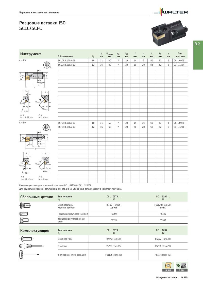 Черновое и чистовое растачивание Резцовые вставки ISO SCLC/SCFC B2 Инструмент b Dc мин. d8 l13 f h l1 l5 t Тип Обозначение h1 мм мм мм мм мм мм мм мм мм пластин κ = 95° SCLCR/L10CA-09 10 11 40 7 20 14 5 50 33 5 CC . . 09T3 . . f SCLCR/L12CA-12 12 16 50 7 20 20 20 55 32 6 CC . . 1204 . . l1 A f 95˚ b B l13 l1 l5 h h t d8 d8 Dcmin Dcmin h1 h1 45˚ 20˚ A–B A–B h1 = 10, 12 mm h1 = 16 mm κ = 90° SCFCR/L10CA-09 10 11 40 7 20 14 15 50 33 5 CC . . 09T3 . . f SCFCR/L12CA-12 12 16 50 7 20 20 20 55 32 6 CC . . 1204 . . l1 A f 90˚ b B 95˚ l13 l5 l1 h h t d8 d8 Dcmin Dcmin h1 h1 45˚ 20˚ A–B A–B h1 = 10, 12 mm h1 = 16 mm Размеры указаны для эталонной пластины CC . . 09T308 / CC . . 120408. Для радиальной/осевой регулировки см. стр. B 645. Сборочные детали входят в комплект поставки. Сборочные детали Тип пластин CC . . 09T3 . . CC . . 1204 . . h1 10 12 Винт пластины FS359 (Torx 15) FS1029 (Torx 20) Момент затяжки 2,5 Нм 5,0 Нм Радиальный регулировочный винт FS369 FS334 Торцевой регулировочный FS335 FS335 винт Комплектующие Тип пластин CC . . 09T3 . . CC . . 1204 . . h1 10 12 Винт ISO 7380 FS976 (Torx 30) FS977 (Torx 30) Отвёртка FS229 (Torx 15) FS228 (Torx 20) T-образный ключ, большой FS1175 (Torx 30) FS1176 (Torx 40) B 510 B 622 Резцовые вставки B 595