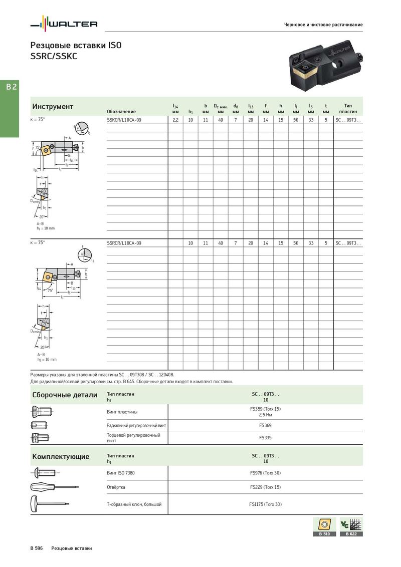 Черновое и чистовое растачивание Резцовые вставки ISO SSRC/SSKC B2 Инструмент l14 b Dc мин. d8 l13 f h l1 l5 t Тип Обозначение мм h1 мм мм мм мм мм мм мм мм мм пластин κ = 75° SSKCR/L10CA-09 2,2 10 11 40 7 20 14 15 50 33 5 SC . . 09T3 . . f l1 A f 75˚ b B l13 l5 l14 l1 h t d8 Dcmin h1 20˚ A–B h1 = 10 mm κ = 75° SSRCR/L10CA-09 10 11 40 7 20 14 15 50 33 5 SC . . 09T3 . . f A l1 f b B l14 75˚ l13 l5 l1 h t d8 Dcmin h1 20˚ A–B h1 = 10 mm Размеры указаны для эталонной пластины SC . . 09T308 / SC . . 120408. Для радиальной/осевой регулировки см. стр. B 645. Сборочные детали входят в комплект поставки. Сборочные детали Тип пластин SC . . 09T3 . . h1 10 Винт пластины FS359 (Torx 15) 2,5 Нм Радиальный регулировочный винт FS369 Торцевой регулировочный FS335 винт Комплектующие Тип пластин SC . . 09T3 . . h1 10 Винт ISO 7380 FS976 (Torx 30) Отвёртка FS229 (Torx 15) T-образный ключ, большой FS1175 (Torx 30) B 510 B 622 B 596 Резцовые вставки