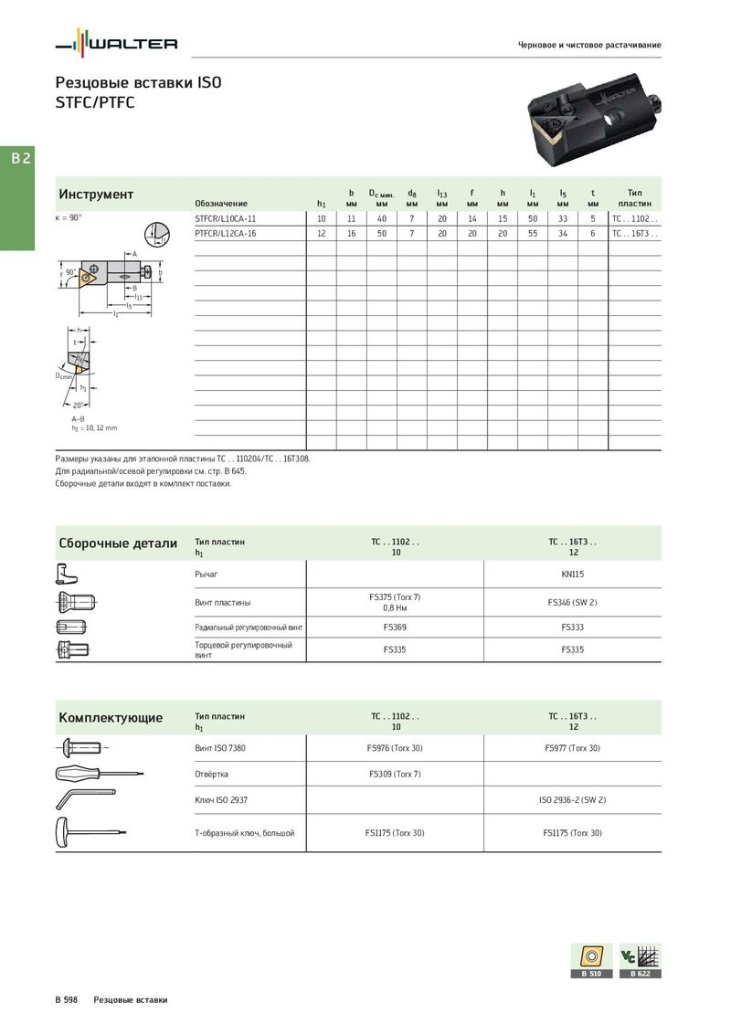 Черновое и чистовое растачивание Резцовые вставки ISO STFC/PTFC B2 Инструмент b Dc мин. d8 l13 f h l1 l5 t Тип Обозначение h1 мм мм мм мм мм мм мм мм мм пластин κ = 90° STFCR/L10CA-11 10 11 40 7 20 14 15 50 33 5 TC . . 1102 . . f PTFCR/L12CA-16 12 16 50 7 20 20 20 55 34 6 TC . . 16T3 . . l1 A f 90˚ b B l13 l5 l1 h t d8 Dcmin h1 20˚ A–B h1 = 10, 12 mm Размеры указаны для эталонной пластины TC . . 110204/TC . . 16T308. Для радиальной/осевой регулировки см. стр. B 645. Сборочные детали входят в комплект поставки. Сборочные детали Тип пластин TC . . 1102 . . TC . . 16T3 . . h1 10 12 Рычаг KN115 Винт пластины FS375 (Torx 7) FS346 (SW 2) 0,8 Нм Радиальный регулировочный винт FS369 FS333 Торцевой регулировочный FS335 FS335 винт Комплектующие Тип пластин TC . . 1102 . . TC . . 16T3 . . h1 10 12 Винт ISO 7380 FS976 (Torx 30) FS977 (Torx 30) Отвёртка FS309 (Torx 7) Ключ ISO 2937 ISO 2936-2 (SW 2) T-образный ключ, большой FS1175 (Torx 30) FS1175 (Torx 30) B 510 B 622 B 598 Резцовые вставки