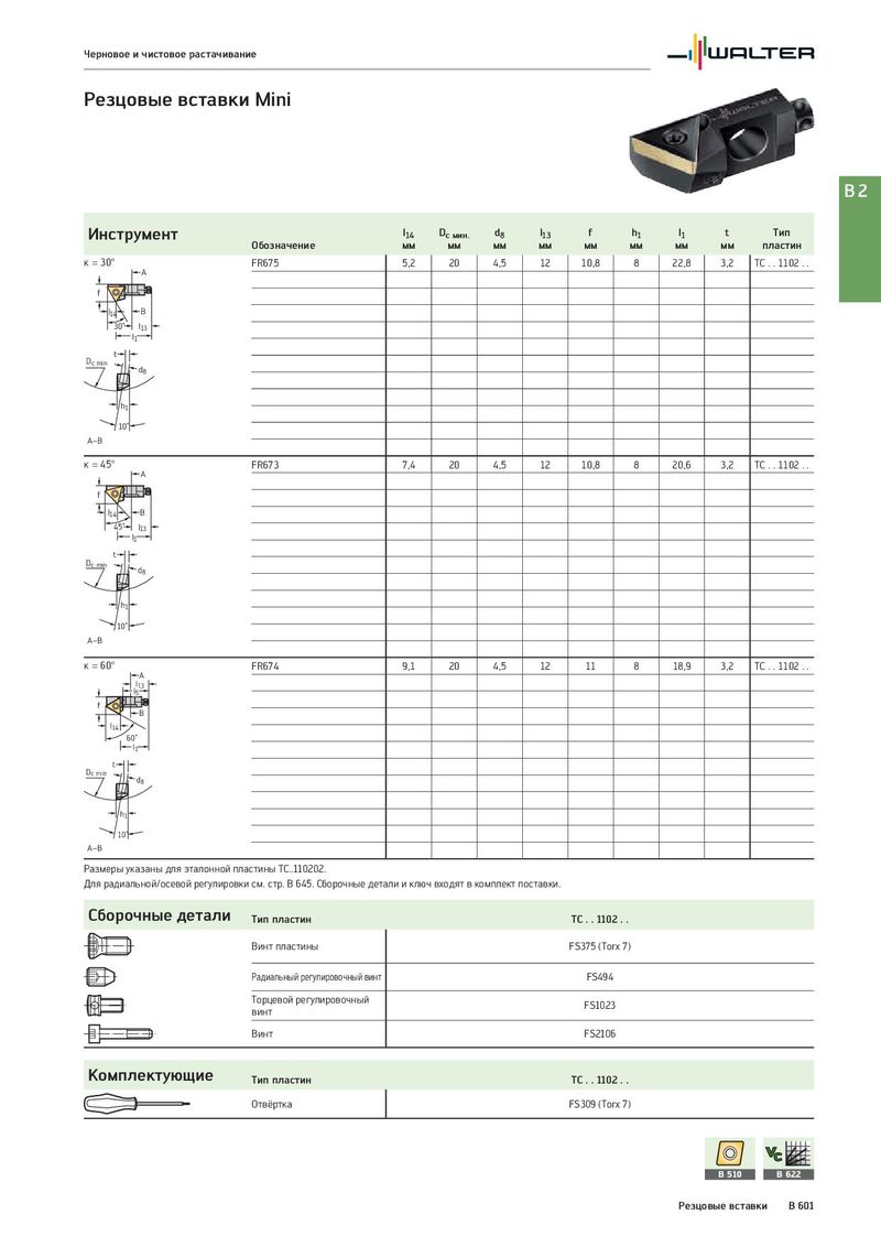 Черновое и чистовое растачивание Резцовые вставки Mini B2 Инструмент l14 Dc мин. d8 l13 f h1 l1 t Тип Обозначение мм мм мм мм мм мм мм мм пластин κ = 30° FR675 5,2 20 4,5 12 10,8 8 22,8 3,2 TC . . 1102 . . A f l14 B 30˚ l13 l1 Dc min t d8 h1 10˚ A–B κ = 45° FR673 7,4 20 4,5 12 10,8 8 20,6 3,2 TC . . 1102 . . A f l14 B 45˚ l13 l1 t Dc min d8 h1 10˚ A–B κ = 60° FR674 9,1 20 4,5 12 11 8 18,9 3,2 TC . . 1102 . . A l13 l5 f B l14 60˚ l1 Dc min t d8 h1 10˚ A–B Размеры указаны для эталонной пластины TC..110202. Для радиальной/осевой регулировки см. стр. B 645. Сборочные детали и ключ входят в комплект поставки. Сборочные детали Тип пластин TC . . 1102 . . Винт пластины FS375 (Torx 7) Радиальный регулировочный винт FS494 Торцевой регулировочный FS1023 винт Винт FS2106 Комплектующие Тип пластин TC . . 1102 . . Отвёртка FS309 (Torx 7) B 510 B 622 Резцовые вставки B 601