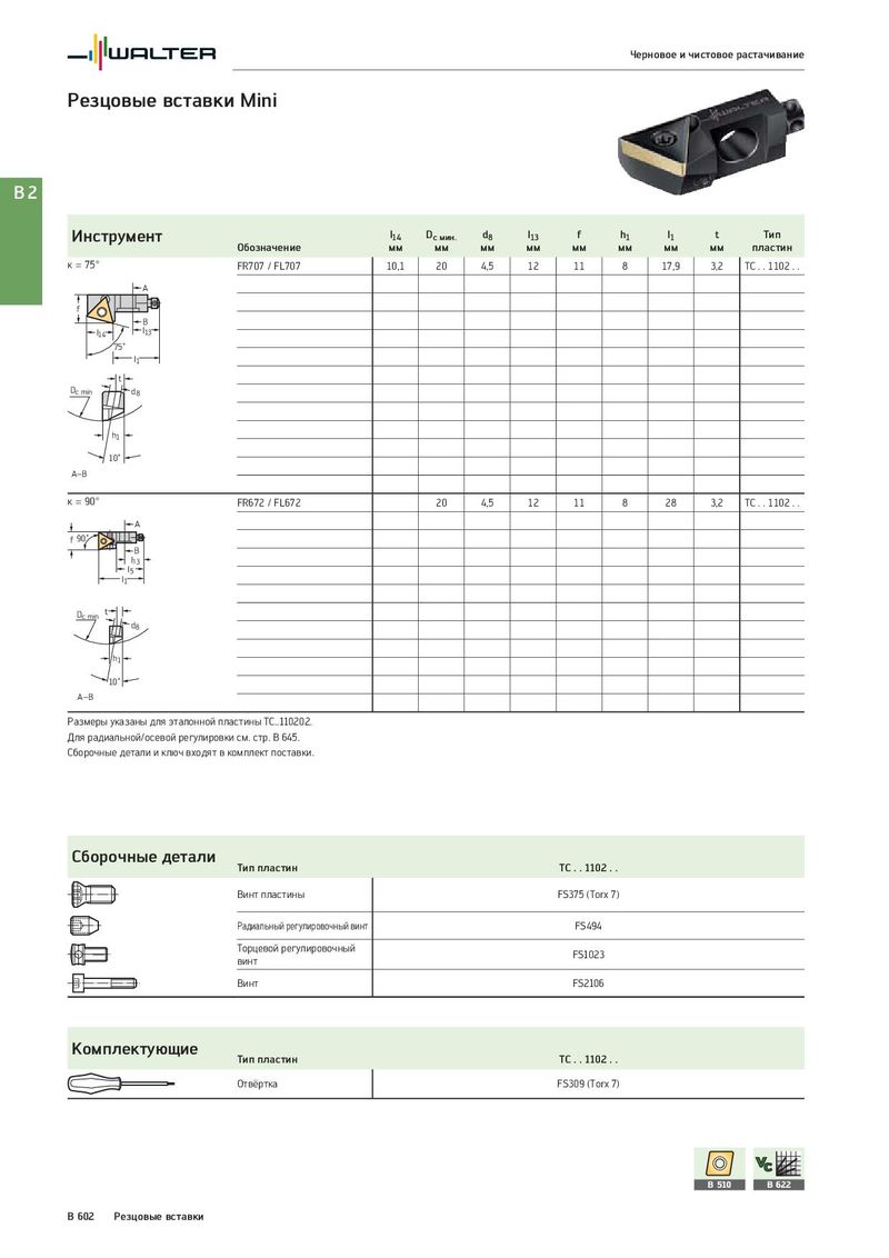 Черновое и чистовое растачивание Резцовые вставки Mini B2 Инструмент l14 Dc мин. d8 l13 f h1 l1 t Тип Обозначение мм мм мм мм мм мм мм мм пластин κ = 75° FR707 / FL707 10,1 20 4,5 12 11 8 17,9 3,2 TC . . 1102 . . A f B l13 l14 75˚ l1 t Dc min d8 h1 10˚ A–B κ = 90° FR672 / FL672 20 4,5 12 11 8 28 3,2 TC . . 1102 . . A f 90˚ B l13 l5 l1 Dc min t d8 h1 10˚ A–B Размеры указаны для эталонной пластины TC..110202. Для радиальной/осевой регулировки см. стр. B 645. Сборочные детали и ключ входят в комплект поставки. Сборочные детали Тип пластин TC . . 1102 . . Винт пластины FS375 (Torx 7) Радиальный регулировочный винт FS494 Торцевой регулировочный FS1023 винт Винт FS2106 Комплектующие Тип пластин TC . . 1102 . . Отвёртка FS309 (Torx 7) B 510 B 622 B 602 Резцовые вставки