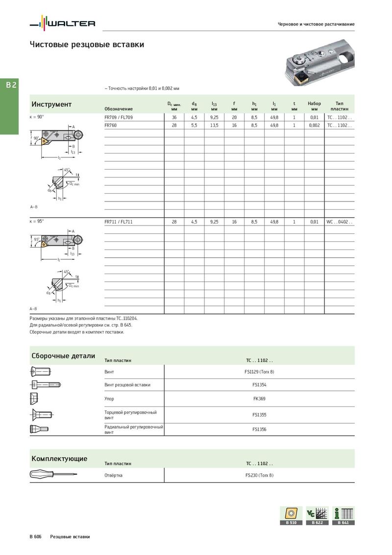 Черновое и чистовое растачивание Чистовые резцовые вставки B2 – Точность настройки 0,01 и 0,002 мм Инструмент Dc мин. d8 l13 f h1 l1 t Набор Тип Обозначение мм мм мм мм мм мм мм мм пластин κ = 90° FR709 / FL709 36 4,5 9,25 20 8,5 49,8 1 0,01 TC . . 1102 . . A FR760 28 5,5 13,5 16 8,5 49,8 1 0,002 TC . . 1102 . . f 90˚ B l13 l1 45˚ t Dc min d8 h1 A–B κ = 95° FR711 / FL711 28 4,5 9,25 16 8,5 49,8 1 0,01 WC . . 0402 . . A f 95˚ B l13 l1 45˚ t Dc min d8 h1 A–B Размеры указаны для эталонной пластины TC..110204. Для радиальной/осевой регулировки см. стр. B 645. Сборочные детали входят в комплект поставки. Сборочные детали Тип пластин TC . . 1102 . . Винт FS1129 (Torx 8) Винт резцовой вставки FS1354 Упор FK369 Торцевой регулировочный FS1355 винт Радиальный регулировочный FS1356 винт Комплектующие Тип пластин TC . . 1102 . . Отвёртка FS230 (Torx 8) B 510 B 622 B 641 B 606 Резцовые вставки