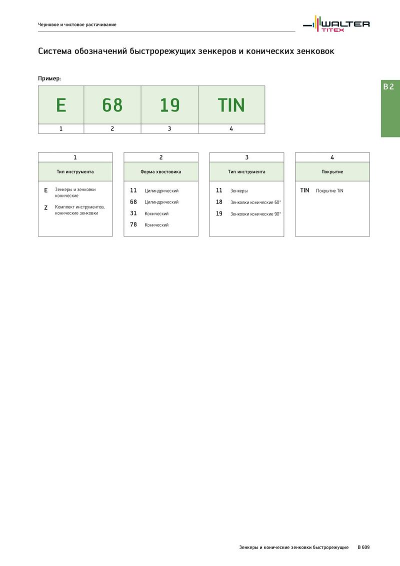 Черновое и чистовое растачивание Система обозначений быстрорежущих зенкеров и конических зенковок Пример: B2 E 68 19 TIN 1 2 3 4 1 2 3 4 Тип инструмента Форма хвостовика Тип инструмента Покрытие E Зенкеры и зенковки 11 Цилиндрический 11 Зенкеры TIN Покрытие TiN конические 68 Цилиндрический 18 Зенковки конические 60° Z Комплект инструментов, конические зенковки 31 Конический 19 Зенковки конические 90° 78 Конический Зенкеры и конические зенковки быстрорежущие B 609