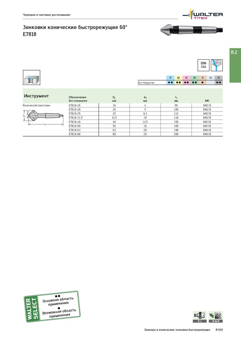 Черновое и чистовое растачивание Зенковки конические быстрорежущие 60° E7818 B2 DIN 334 P M K N S H O Без покрытия CC CC CC CC C CC Инструмент Обозначение Dc d3 l1 Без покрытия мм мм мм MK Конический хвостовик E7818-16 16 4 90 MK1 B d3 E7818-20 20 5 106 MK2 B Dc E7818-25 25 6,3 112 MK2 B E7818-31.5 31,5 10 118 MK2 B E7818-40 40 12,5 150 MK3 B l1 E7818-50 50 16 160 MK3 B E7818-63 63 20 190 MK4 B E7818-80 80 25 200 MK4 B Оснпорвинмаеяноебнлиаясть Возмпоржимнаеянеонбиляасть D1 B 648 Зенкеры и конические зенковки быстрорежущие B 619