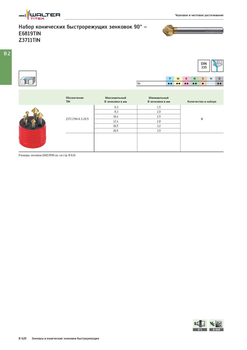Черновое и чистовое растачивание Набор конических быстрорежущих зенковок 90° – E6819TIN Z3711TIN B2 DIN 335 P M K N S H O TIN CC CC CC CC C CC Обозначение Максимальный Минимальный TIN Ø зенковки в мм Ø зенковки в мм Количество в наборе 6,3 1,5 8,3 2,0 Z3711TIN-6.3-20.5 10,4 2,5 6 12,4 2,8 16,5 3,2 20,5 3,5 Размеры зенковок E6819TIN см. на стр. B 616 D1 B 648 B 620 Зенкеры и конические зенковки быстрорежущие