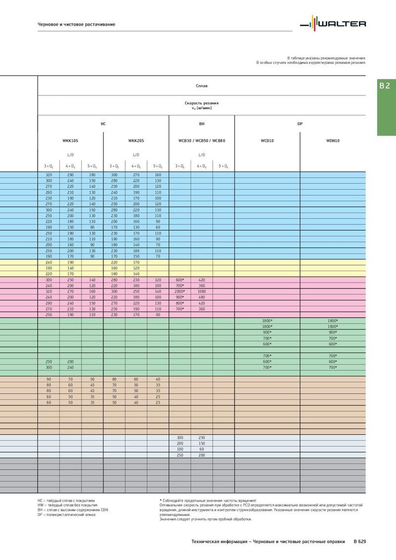 Черновое и чистовое растачивание В таблице указаны рекомендуемые значения. В особых случаях необходима корректировка режимов резания. Сплав B2 Скорость резания vc [м/мин] HC BH DP WKK10S WKK20S WCB30 / WCB50 / WCB80 WCD10 WDN10 L/D L/D L/D 3 × Dc 4 × Dc 5 × Dc 3 × Dc 4 × Dc 5 × Dc 3 × Dc 4 × Dc 5 × Dc 320 290 180 300 270 160 300 240 150 280 220 130 270 220 140 250 200 120 260 210 130 240 190 110 230 190 120 210 170 100 270 220 140 250 200 120 300 240 150 280 220 130 250 200 130 230 180 110 220 180 110 200 160 90 190 150 80 170 130 60 250 190 130 230 170 110 210 180 110 190 160 90 200 160 90 180 140 70 250 200 130 230 180 110 190 170 90 170 150 70 240 190 220 170 190 140 160 120 220 170 180 140 300 250 140 280 230 120 600* 420 240 200 120 220 180 100 700* 360 320 270 160 300 250 140 2000* 1080 240 200 120 220 180 100 900* 480 290 240 150 270 220 130 800* 420 270 210 130 250 190 110 700* 360 250 190 110 230 170 90 1800* 1800* 1800* 1800* 900* 900* 700* 700* 600* 600* 700* 700* 250 200 600* 600* 300 240 700* 700* 90 70 50 80 60 40 80 60 45 70 50 35 80 60 45 70 50 35 60 50 35 50 40 25 60 50 35 50 40 25 300 250 200 150 100 60 250 200 HC = твёрдый сплав с покрытием * Соблюдайте предельные значения частоты вращения! HW = твёрдый сплав без покрытия Оптимальная скорость резания при обработке с PCD определяется максимально возможной или допустимой частотой BH = сплав с высоким содержанием CBN вращения, длиной инструмента и контролем стружкообразования. Указанные значения скорости резания являются DP = поликристаллический алмаз рекомендуемыми. Значения следует уточнять путем пробной обработки. Техническая информация – Черновые и чистовые расточные оправки B 629