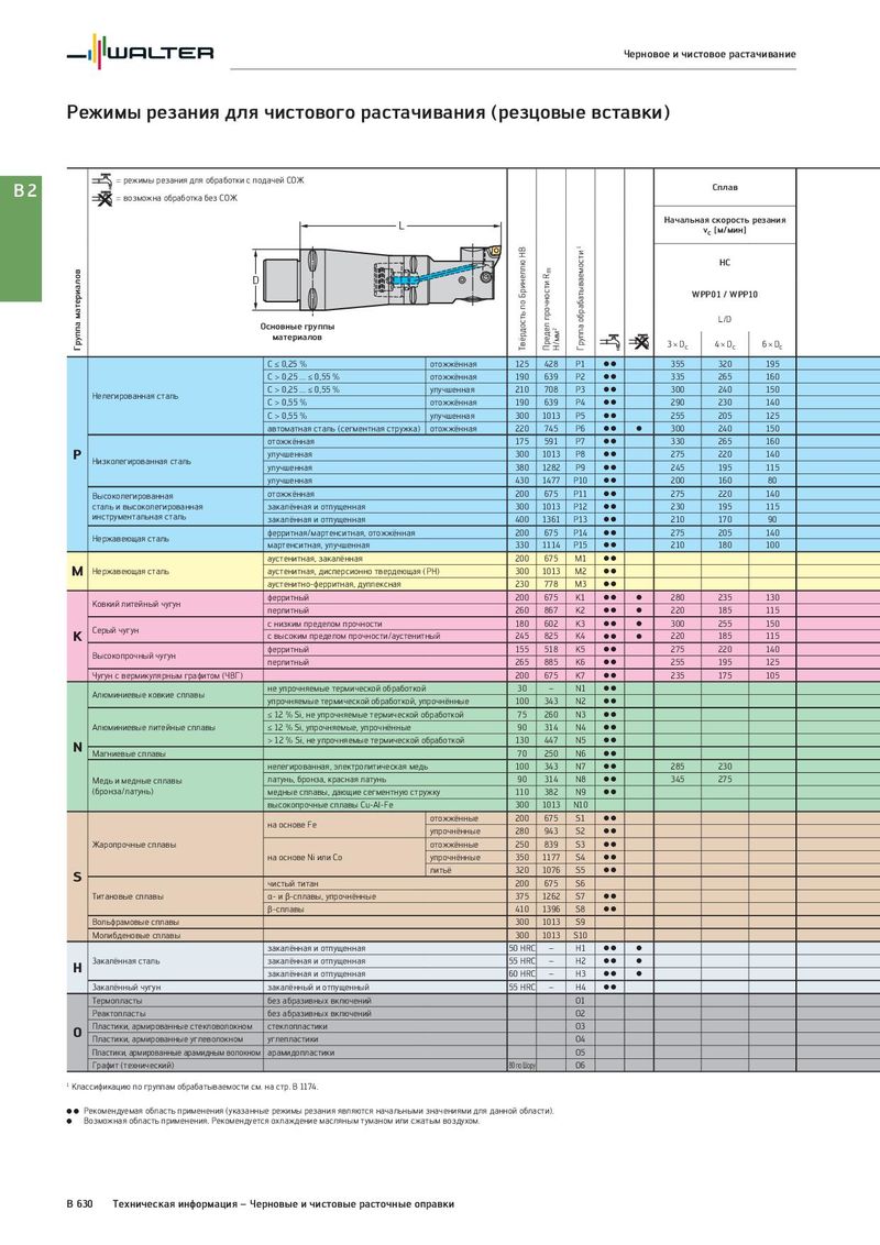 Черновое и чистовое растачивание Режимы резания для чистового растачивания (резцовые вставки) B2 = режимы резания для обработки с подачей СОЖ Сплав = возможна обработка без СОЖ L Начальная скорость резания vc [м/мин] Твёрдость по Бринеллю HB Группа обрабатываемости 1 HC Группа материалов D Предел прочности Rm WPP01 / WPP10 Основные группы L/D материалов Н/мм2 3 × Dc 4 × Dc 6 × Dc C ≤ 0,25 % отожжённая 125 428 P1 CC 355 320 195 C > 0,25 ... ≤ 0,55 % отожжённая 190 639 P2 CC 335 265 160 Нелегированная сталь C > 0,25 ... ≤ 0,55 % улучшенная 210 708 P3 CC 300 240 150 C > 0,55 % отожжённая 190 639 P4 CC 290 230 140 C > 0,55 % улучшенная 300 1013 P5 CC 255 205 125 автоматная сталь (сегментная стружка) отожжённая 220 745 P6 CC C 300 240 150 отожжённая 175 591 P7 CC 330 265 160 P Низколегированная сталь улучшенная 300 1013 P8 CC 275 220 140 улучшенная 380 1282 P9 CC 245 195 115 улучшенная 430 1477 P10 CC 200 160 80 Высоколегированная отожжённая 200 675 P11 CC 275 220 140 сталь и высоколегированная закалённая и отпущенная 300 1013 P12 CC 230 195 115 инструментальная сталь закалённая и отпущенная 400 1361 P13 CC 210 170 90 Нержавеющая сталь ферритная/мартенситная, отожжённая 200 675 P14 CC 275 205 140 мартенситная, улучшенная 330 1114 P15 CC 210 180 100 аустенитная, закалённая 200 675 M1 CC M Нержавеющая сталь аустенитная, дисперсионно твердеющая (PH) 300 1013 M2 CC аустенитно-ферритная, дуплексная 230 778 M3 CC Ковкий литейный чугун ферритный 200 675 K1 CC C 280 235 130 перлитный 260 867 K2 CC C 220 185 115 Серый чугун с низким пределом прочности 180 602 K3 CC C 300 255 150 K с высоким пределом прочности/аустенитный 245 825 K4 CC C 220 185 115 Высокопрочный чугун ферритный 155 518 K5 CC 275 220 140 перлитный 265 885 K6 CC 255 195 125 Чугун с вермикулярным графитом (ЧВГ) 200 675 K7 CC 235 175 105 Алюминиевые ковкие сплавы не упрочняемые термической обработкой 30 – N1 CC упрочняемые термической обработкой, упрочнённые 100 343 N2 CC ≤ 12 % Si, не упрочняемые термической обработкой 75 260 N3 CC Алюминиевые литейные сплавы ≤ 12 % Si, упрочняемые, упрочнённые 90 314 N4 CC N > 12 % Si, не упрочняемые термической обработкой 130 447 N5 CC Магниевые сплавы 70 250 N6 CC нелегированная, электролитическая медь 100 343 N7 CC 285 230 Медь и медные сплавы латунь, бронза, красная латунь 90 314 N8 CC 345 275 (бронза/латунь) медные сплавы, дающие сегментную стружку 110 382 N9 CC высокопрочные сплавы Cu-Al-Fe 300 1013 N10 на основе Fe отожжённые 200 675 S1 CC упрочнённые 280 943 S2 CC Жаропрочные сплавы отожжённые 250 839 S3 CC на основе Ni или Co упрочнённые 350 1177 S4 CC S литьё 320 1076 S5 CC чистый титан 200 675 S6 Титановые сплавы α- и β-сплавы, упрочнённые 375 1262 S7 CC β-сплавы 410 1396 S8 CC Вольфрамовые сплавы 300 1013 S9 Молибденовые сплавы 300 1013 S10 закалённая и отпущенная 50 HRC – H1 CC C H Закалённая сталь закалённая и отпущенная 55 HRC – H2 CC C закалённая и отпущенная 60 HRC – H3 CC C Закалённый чугун закалённый и отпущенный 55 HRC – H4 CC Термопласты без абразивных включений O1 Реактопласты без абразивных включений O2 O Пластики, армированные стекловолокном стеклопластики O3 Пластики, армированные углеволокном углепластики O4 Пластики, армированные арамидным волокном арамидопластики O5 Графит (технический) 80 по Шору O6 1 Классификацию по группам обрабатываемости см. на стр. B 1174. CC Рекомендуемая область применения (указанные режимы резания являются начальными значениями для данной области). C Возможная область применения. Рекомендуется охлаждение масляным туманом или сжатым воздухом. B 630 Техническая информация – Черновые и чистовые расточные оправки
