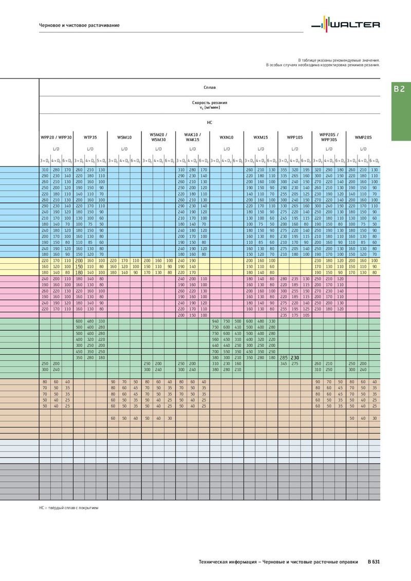 Черновое и чистовое растачивание В таблице указаны рекомендуемые значения. В особых случаях необходима корректировка режимов резания. Сплав B2 Скорость резания vc [м/мин] HC WPP20 / WPP30 WTP35 WSM10 WSM20 / WAK10 / WXN10 WXM15 WPP10S WPP20S / WMP20S WSM30 WAK15 WPP30S L/D L/D L/D L/D L/D L/D L/D L/D L/D L/D 3 × Dc 4 × Dc 6 × Dc 3 × Dc 4 × Dc 5 × Dc 3 × Dc 4 × Dc 6 × Dc 3 × Dc 4 × Dc 6 × Dc 3 × Dc 4 × Dc 6 × Dc 3 × Dc 4 × Dc 6 × Dc 3 × Dc 4 × Dc 6 × Dc 3 × Dc 4 × Dc 6 × Dc 3 × Dc 4 × Dc 6 × Dc 3 × Dc 4 × Dc 6 × Dc 310 280 170 260 210 130 310 280 170 260 210 130 355 320 195 320 290 180 260 210 130 290 230 140 220 180 110 290 230 140 220 180 110 335 265 160 300 240 150 220 180 110 260 210 130 200 160 100 260 210 130 200 160 100 300 240 150 270 220 140 200 160 100 250 200 120 190 150 90 250 200 120 190 150 90 290 230 140 260 210 130 190 150 90 220 180 110 140 110 70 220 180 110 140 110 70 255 205 125 230 190 120 140 110 70 260 210 130 200 160 100 260 210 130 200 160 100 300 240 150 270 220 140 200 160 100 290 230 140 220 170 110 290 230 140 220 170 110 330 265 160 300 240 150 220 170 110 240 190 120 180 150 90 240 190 120 180 150 90 275 220 140 250 200 130 180 150 90 210 170 100 130 100 60 210 170 100 130 100 60 245 195 115 220 180 110 130 100 60 180 140 70 100 75 50 180 140 70 100 75 50 200 160 80 190 150 80 100 75 50 240 180 120 180 150 90 240 180 120 180 150 90 275 220 140 250 190 130 180 150 90 200 170 100 160 130 80 200 170 100 160 130 80 230 195 115 210 180 110 160 130 80 190 150 80 110 85 60 190 150 80 110 85 60 210 170 90 200 160 90 110 85 60 240 190 120 160 130 80 240 190 120 160 130 80 275 205 140 250 200 130 160 130 80 180 160 90 150 120 70 180 160 80 150 120 70 210 180 100 190 170 100 150 120 70 220 170 110 200 160 100 220 170 110 200 160 100 240 190 200 160 100 230 180 120 200 160 100 160 120 100 150 110 80 160 120 100 150 110 90 190 140 150 110 60 170 130 110 150 110 90 180 140 80 180 140 100 180 140 90 170 130 80 220 170 180 140 80 190 150 90 170 130 80 240 200 110 180 140 80 240 200 110 180 140 80 280 235 130 250 210 120 190 160 100 160 130 80 190 160 100 160 130 80 220 185 115 200 170 110 260 220 130 220 160 100 260 220 130 200 160 100 300 255 150 270 230 140 190 160 100 160 130 80 190 160 100 160 130 80 220 185 115 200 170 110 240 190 120 180 140 90 240 190 120 180 140 90 275 220 140 250 200 130 220 170 110 160 130 80 220 170 110 160 130 80 255 195 125 230 180 120 200 150 100 235 175 105 600 480 330 940 750 500 600 480 330 500 400 280 750 600 410 500 400 280 500 400 280 750 600 410 500 400 280 400 320 220 560 450 310 400 320 220 300 250 200 440 440 250 300 250 200 450 350 250 700 550 350 450 350 250 350 280 180 380 300 210 350 280 180 285 230 250 200 250 200 250 200 310 230 160 345 275 260 210 250 200 300 240 300 240 300 240 380 280 210 310 250 300 240 80 60 40 90 70 50 80 60 40 80 60 40 90 70 50 80 60 40 70 50 35 80 60 45 70 50 35 70 50 35 80 60 45 70 50 35 70 50 35 80 60 45 70 50 35 70 50 35 80 60 45 70 50 35 50 40 25 60 50 35 50 40 25 50 40 25 60 50 35 50 40 25 50 40 25 60 50 35 50 40 25 50 40 25 60 50 35 50 40 25 60 50 40 50 40 30 50 40 30 HC = твёрдый сплав с покрытием Техническая информация – Черновые и чистовые расточные оправки B 631
