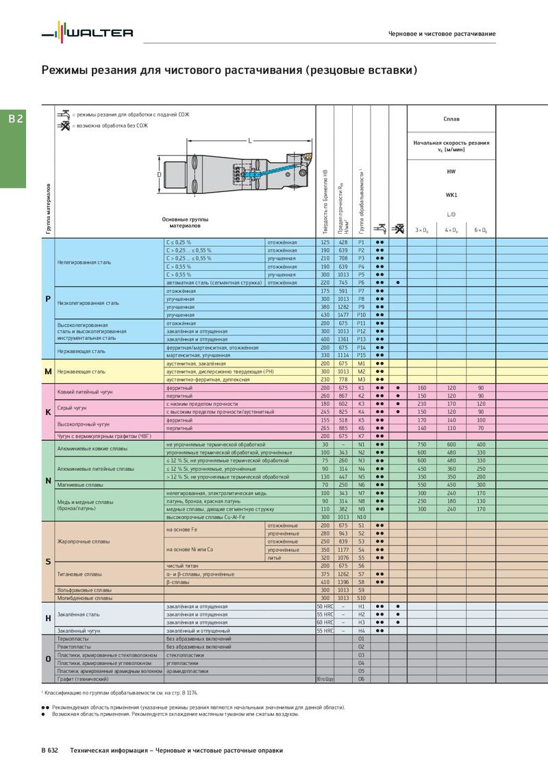 Черновое и чистовое растачивание Режимы резания для чистового растачивания (резцовые вставки) B2 = режимы резания для обработки с подачей СОЖ Сплав = возможна обработка без СОЖ L Начальная скорость резания vc [м/мин] D Твёрдость по Бринеллю HB Группа обрабатываемости 1 HW Группа материалов Предел прочности Rm WK1 Основные группы L/D материалов Н/мм2 3 × Dc 4 × Dc 6 × Dc C ≤ 0,25 % отожжённая 125 428 P1 CC C > 0,25 ... ≤ 0,55 % отожжённая 190 639 P2 CC Нелегированная сталь C > 0,25 ... ≤ 0,55 % улучшенная 210 708 P3 CC C > 0,55 % отожжённая 190 639 P4 CC C > 0,55 % улучшенная 300 1013 P5 CC автоматная сталь (сегментная стружка) отожжённая 220 745 P6 CC C отожжённая 175 591 P7 CC P Низколегированная сталь улучшенная 300 1013 P8 CC улучшенная 380 1282 P9 CC улучшенная 430 1477 P10 CC Высоколегированная отожжённая 200 675 P11 CC сталь и высоколегированная закалённая и отпущенная 300 1013 P12 CC инструментальная сталь закалённая и отпущенная 400 1361 P13 CC Нержавеющая сталь ферритная/мартенситная, отожжённая 200 675 P14 CC мартенситная, улучшенная 330 1114 P15 CC аустенитная, закалённая 200 675 M1 CC M Нержавеющая сталь аустенитная, дисперсионно твердеющая (PH) 300 1013 M2 CC аустенитно-ферритная, дуплексная 230 778 M3 CC Ковкий литейный чугун ферритный 200 675 K1 CC C 160 120 90 перлитный 260 867 K2 CC C 150 120 90 Серый чугун с низким пределом прочности 180 602 K3 CC C 210 170 120 K с высоким пределом прочности/аустенитный 245 825 K4 CC C 150 120 90 Высокопрочный чугун ферритный 155 518 K5 CC 170 140 100 перлитный 265 885 K6 CC 140 110 70 Чугун с вермикулярным графитом (ЧВГ) 200 675 K7 CC Алюминиевые ковкие сплавы не упрочняемые термической обработкой 30 – N1 CC 750 600 400 упрочняемые термической обработкой, упрочнённые 100 343 N2 CC 600 480 330 ≤ 12 % Si, не упрочняемые термической обработкой 75 260 N3 CC 600 480 330 Алюминиевые литейные сплавы ≤ 12 % Si, упрочняемые, упрочнённые 90 314 N4 CC 450 360 250 N > 12 % Si, не упрочняемые термической обработкой 130 447 N5 CC 350 350 200 Магниевые сплавы 70 250 N6 CC 550 450 300 нелегированная, электролитическая медь 100 343 N7 CC 300 240 170 Медь и медные сплавы латунь, бронза, красная латунь 90 314 N8 CC 250 180 130 (бронза/латунь) медные сплавы, дающие сегментную стружку 110 382 N9 CC 300 240 170 высокопрочные сплавы Cu-Al-Fe 300 1013 N10 на основе Fe отожжённые 200 675 S1 CC упрочнённые 280 943 S2 CC Жаропрочные сплавы отожжённые 250 839 S3 CC на основе Ni или Co упрочнённые 350 1177 S4 CC S литьё 320 1076 S5 CC чистый титан 200 675 S6 Титановые сплавы α- и β-сплавы, упрочнённые 375 1262 S7 CC β-сплавы 410 1396 S8 CC Вольфрамовые сплавы 300 1013 S9 Молибденовые сплавы 300 1013 S10 закалённая и отпущенная 50 HRC – H1 CC C H Закалённая сталь закалённая и отпущенная 55 HRC – H2 CC C закалённая и отпущенная 60 HRC – H3 CC C Закалённый чугун закалённый и отпущенный 55 HRC – H4 CC Термопласты без абразивных включений O1 Реактопласты без абразивных включений O2 O Пластики, армированные стекловолокном стеклопластики O3 Пластики, армированные углеволокном углепластики O4 Пластики, армированные арамидным волокном арамидопластики O5 Графит (технический) 80 по Шору O6 1 Классификацию по группам обрабатываемости см. на стр. B 1174. CC Рекомендуемая область применения (указанные режимы резания являются начальными значениями для данной области). C Возможная область применения. Рекомендуется охлаждение масляным туманом или сжатым воздухом. B 632 Техническая информация – Черновые и чистовые расточные оправки