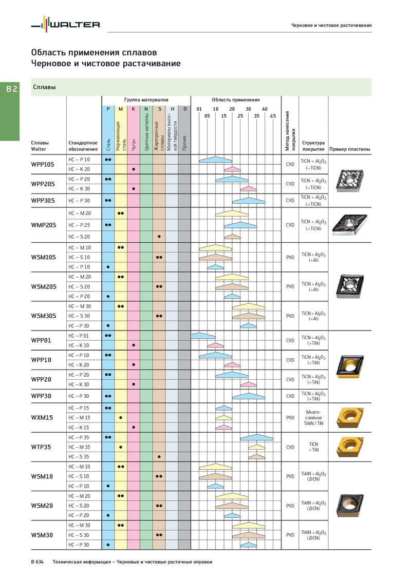 Черновое и чистовое растачивание Область применения сплавов Черновое и чистовое растачивание B2 Сплавы Группа материалов Область применения P M K N S H O 01 10 20 30 40 Метод нанесения Цветные металлы Материалы высо- 05 15 25 35 45 Сплавы Стандартное Сталь Нержавеющая сталь Чугун Жаропрочные сплавы кой твёрдости Прочее покрытия Структура Walter обозначение покрытия Пример пластины HC – P 10 CC TiCN + Al2O3 WPP10S CVD (+TiCN) HC – K 20 C HC – P 20 CC TiCN + Al2O3 WPP20S CVD (+TiCN) HC – K 30 C WPP30S HC – P 30 CC CVD TiCN + Al2O3 (+TiCN) HC – M 20 CC WMP20S HC – P 25 CC CVD TiCN + Al2O3 (+TiCN) HC – S 20 C HC – M 10 CC WSM10S HC – S 10 CC PVD TiCN + Al2O3 (+Al) HC – P 10 C HC – M 20 CC WSM20S HC – S 20 CC PVD TiCN + Al2O3 (+Al) HC – P 20 C HC – M 30 CC WSM30S HC – S 30 CC PVD TiCN + Al2O3 (+Al) HC – P 30 C HC – P 01 CC TiCN + Al2O3 WPP01 CVD (+TiN) HC – K 10 C HC – P 10 CC TiCN + Al2O3 WPP10 CVD (+TiN) HC – K 20 C HC – P 20 CC TiCN + Al2O3 WPP20 CVD (+TiN) HC – K 30 C WPP30 HC – P 30 CC CVD TiCN + Al2O3 (+TiN) HC – P 15 CC Много- WXM15 HC – M 15 C PVD слойное HC – K 15 TiAlN / TiN C HC – P 35 CC WTP35 HC – M 35 C CVD TiCN + TiN HC – S 35 C HC – M 10 CC WSM10 HC – S 10 CC PVD TiAlN + Al2O3 (ZrCN) HC – P 10 C HC – M 20 CC WSM20 HC – S 20 CC PVD TiAlN + Al2O3 (ZrCN) HC – P 20 C HC – M 30 CC WSM30 HC – S 30 CC PVD TiAlN + Al2O3 (ZrCN) HC – P 30 C B 634 Техническая информация – Черновые и чистовые расточные оправки