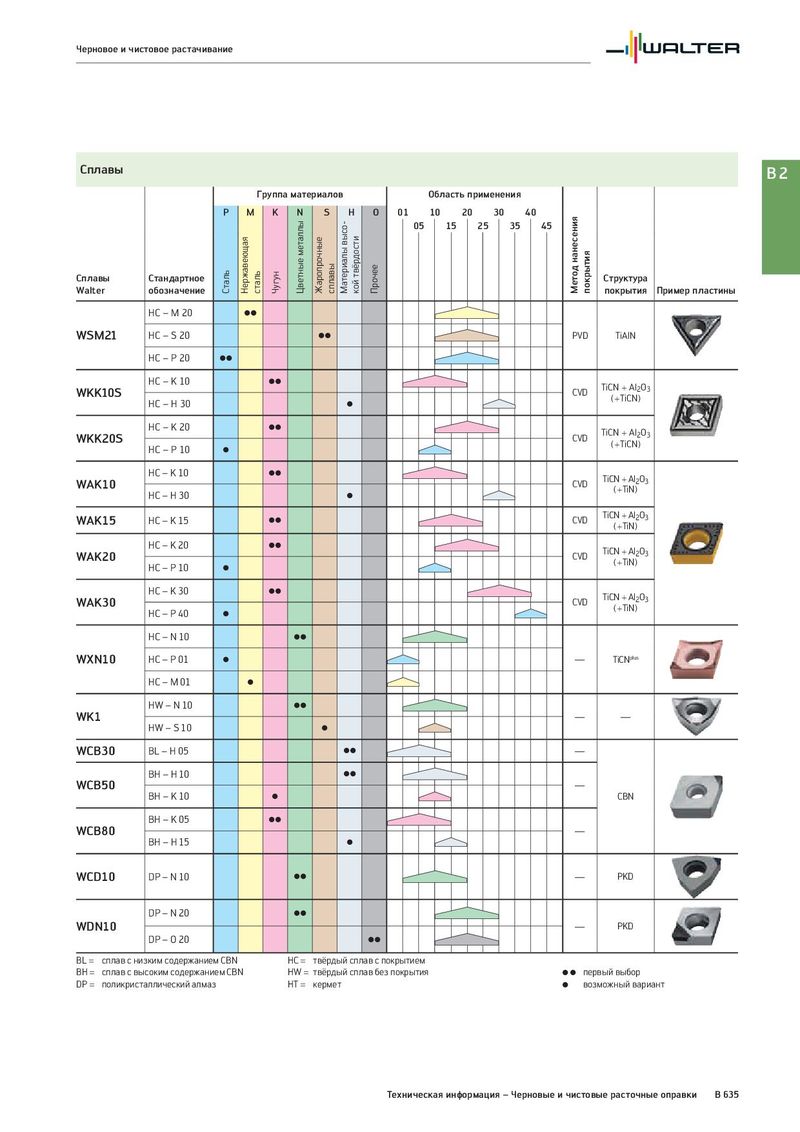 Черновое и чистовое растачивание Сплавы B2 Группа материалов Область применения P M K N S H O 01 10 20 30 40 Метод нанесения Цветные металлы Материалы высо- 05 15 25 35 45 Сплавы Стандартное Сталь Нержавеющая сталь Чугун Жаропрочные сплавы кой твёрдости Прочее покрытия Структура Walter обозначение покрытия Пример пластины HC – M 20 CC WSM21 HC – S 20 CC PVD TiAlN HC – P 20 CC HC – K 10 CC TiCN + Al2O3 WKK10S CVD (+TiCN) HC – H 30 C HC – K 20 CC TiCN + Al2O3 WKK20S CVD (+TiCN) HC – P 10 C HC – K 10 CC TiCN + Al2O3 WAK10 CVD (+TiN) HC – H 30 C WAK15 HC – K 15 CC CVD TiCN + Al2O3 (+TiN) HC – K 20 CC TiCN + Al2O3 WAK20 CVD (+TiN) HC – P 10 C HC – K 30 CC TiCN + Al2O3 WAK30 CVD (+TiN) HC – P 40 C HC – N 10 CC WXN10 HC – P 01 C — TiCNplus HC – M 01 C HW – N 10 CC WK1 — — HW – S 10 C WCB30 BL – H 05 CC — BH – H 10 CC WCB50 — BH – K 10 C CBN BH – K 05 CC WCB80 — BH – H 15 C WCD10 DP – N 10 CC — PKD DP – N 20 CC WDN10 — PKD DP – O 20 CC BL = сплав с низким содержанием CBN HC = твёрдый сплав с покрытием BH = сплав с высоким содержанием CBN HW = твёрдый сплав без покрытия C C первый выбор DP = поликристаллический алмаз HT = кермет C возможный вариант Техническая информация – Черновые и чистовые расточные оправки B 635