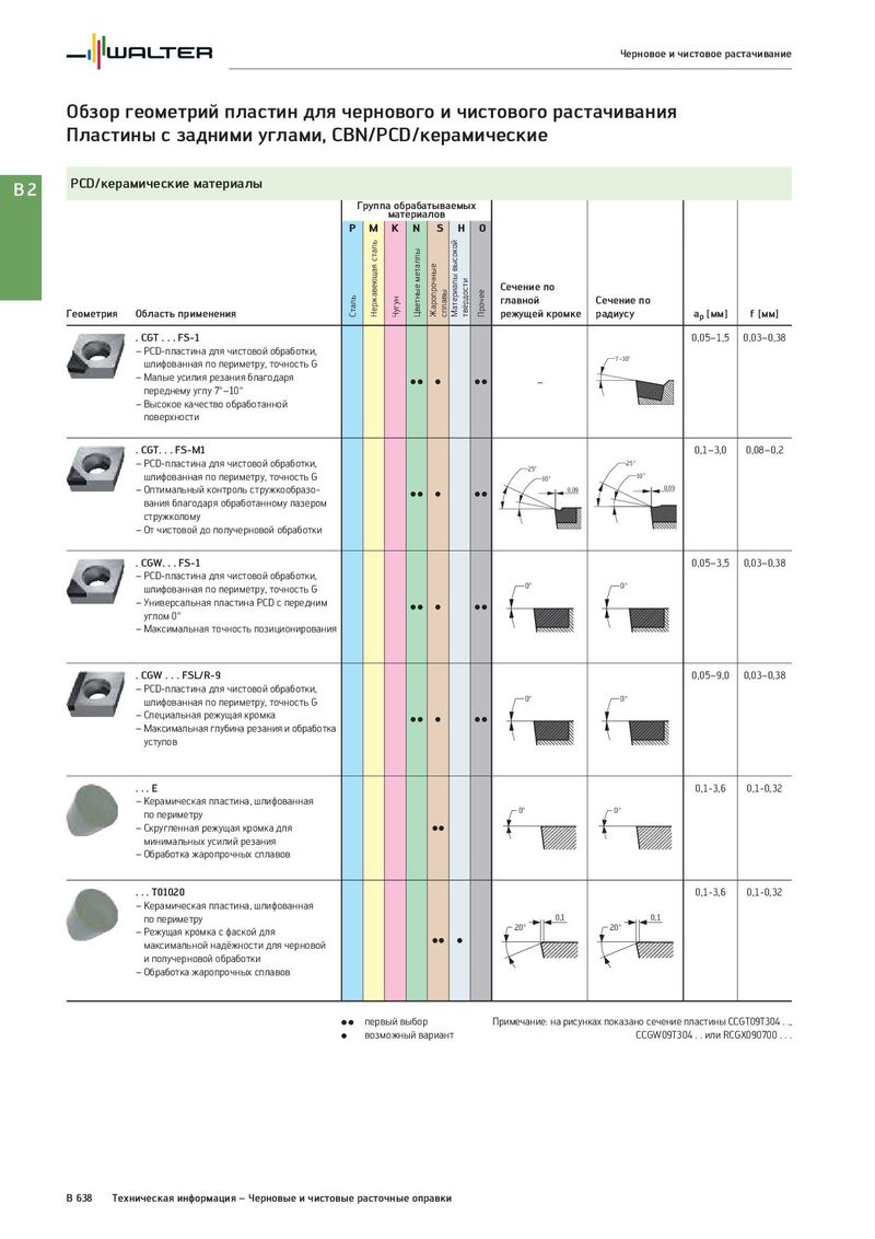 Черновое и чистовое растачивание Обзор геометрий пластин для чернового и чистового растачивания Пластины с задними углами, CBN/PCD/керамические B2 PCD/керамические материалы Группа обрабатываемых материалов P M K N S H O Нержавеющая сталь Цветные металлы Жаропрочные сплавы Материалы высокой твёрдости Прочее Сечение по Сталь Чугун главной Сечение по Геометрия Область применения режущей кромке радиусу ap [мм] f [мм] . CGT . . . FS-1 0,05–1,5 0,03–0,38 – PCD-пластина для чистовой обработки, 7−10° шлифованная по периметру, точность G – Малые усилия резания благодаря CC C CC – переднему углу 7°–10° – Высокое качество обработанной поверхности . CGT. . . FS-M1 0,1–3,0 0,08–0,2 – PCD-пластина для чистовой обработки, 25° 25° шлифованная по периметру, точность G 10° 10° – Оптимальный контроль стружкообразо- CC C CC 0,09 0,09 вания благодаря обработанному лазером стружколому – От чистовой до получерновой обработки . CGW. . . FS-1 0,05–3,5 0,03–0,38 – PCD-пластина для чистовой обработки, шлифованная по периметру, точность G 0° 0° – Универсальная пластина PCD с передним CC C CC углом 0° – Максимальная точность позиционирования . CGW . . . FSL/R-9 0,05–9,0 0,03–0,38 – PCD-пластина для чистовой обработки, шлифованная по периметру, точность G 0° 0° – Специальная режущая кромка CC C CC – Максимальная глубина резания и обработка уступов ...E 0,1-3,6 0,1-0,32 – Керамическая пластина, шлифованная по периметру 0° 0° – Скругленная режущая кромка для CC минимальных усилий резания – Обработка жаропрочных сплавов . . . T01020 0,1-3,6 0,1-0,32 – Керамическая пластина, шлифованная по периметру 0,1 0,1 – Режущая кромка с фаской для 20° 20° максимальной надёжности для черновой CC C и получерновой обработки – Обработка жаропрочных сплавов CC первый выбор Примечание: на рисунках показано сечение пластины CCGT09T304 . ., C возможный вариант CCGW09T304 . . или RCGX090700 . . . B 638 Техническая информация – Черновые и чистовые расточные оправки