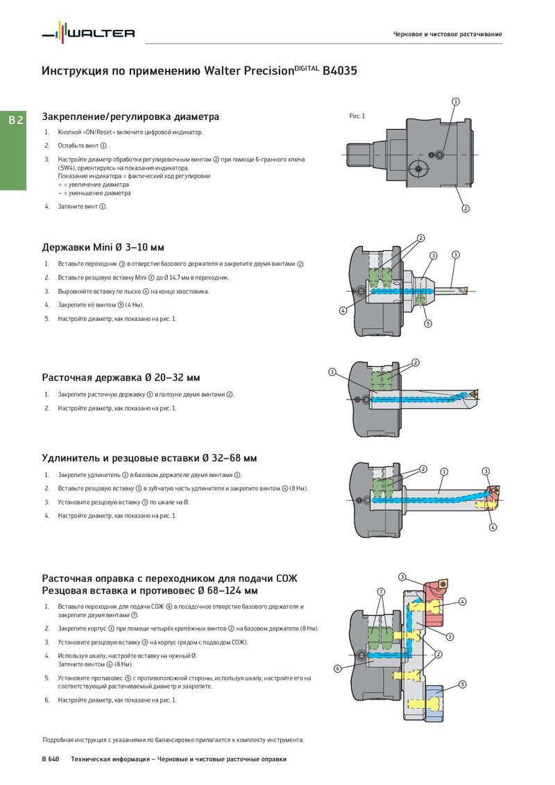 Черновое и чистовое растачивание Инструкция по применению Walter PrecisionDIGITAL B4035 x B2 Закрепление/регулировка диаметра Рис. 1 1. Кнопкой «ON/Reset» включите цифровой индикатор. 2. Ослабьте винт x. 3. Настройте диаметр обработки регулировочным винтом y при помощи 6-гранного ключа (SW4), ориентируясь на показания индикатора. Показание индикатора = фактический ход регулировки + = увеличение диаметра – = уменьшение диаметра 4. Затяните винт x. y Державки Mini Ø 3–10 мм y Вставьте переходник z в отверстие базового держателя и закрепите двумя винтами y. z x 1. 2. Вставьте резцовую вставку Mini x до Ø 14,7 мм в переходник. 3. Выровняйте вставку по лыске { на конце хвостовика. 4. Закрепите её винтом | (4 Нм). { 5. Настройте диаметр, как показано на рис. 1. | x y Расточная державка Ø 20–32 мм 1. Закрепите расточную державку x в ползуне двумя винтами y. 2. Настройте диаметр, как показано на рис. 1. Удлинитель и резцовые вставки Ø 32–68 мм 1. Закрепите удлинитель x в базовом держателе двумя винтами y. y x z 2. Вставьте резцовую вставку z в зубчатую часть удлинителя и закрепите винтом { (8 Нм). 3. Установите резцовую вставку z по шкале на Ø. 4. Настройте диаметр, как показано на рис. 1. { Расточная оправка с переходником для подачи СОЖ z Резцовая вставка и противовес Ø 68–124 мм ~ 1. Вставьте переходник для подачи СОЖ } в посадочное отверстие базового держателя и { закрепите двумя винтами ~. 2. Закрепите корпус x при помощи четырёх крепёжных винтов y на базовом держателе (8 Нм). 3. Установите резцовую вставку z на корпус (рядом с подводом СОЖ). x 4. Используя шкалу, настройте вставку на нужный Ø. y Затяните винтом { (8 Нм). } 5. Установите противовес | с противоположной стороны, используя шкалу, настройте его на | соответствующий растачиваемый диаметр и закрепите. 6. Настройте диаметр, как показано на рис. 1. Подробная инструкция с указаниями по балансировке прилагается к комплекту инструмента. B 640 Техническая информация – Черновые и чистовые расточные оправки