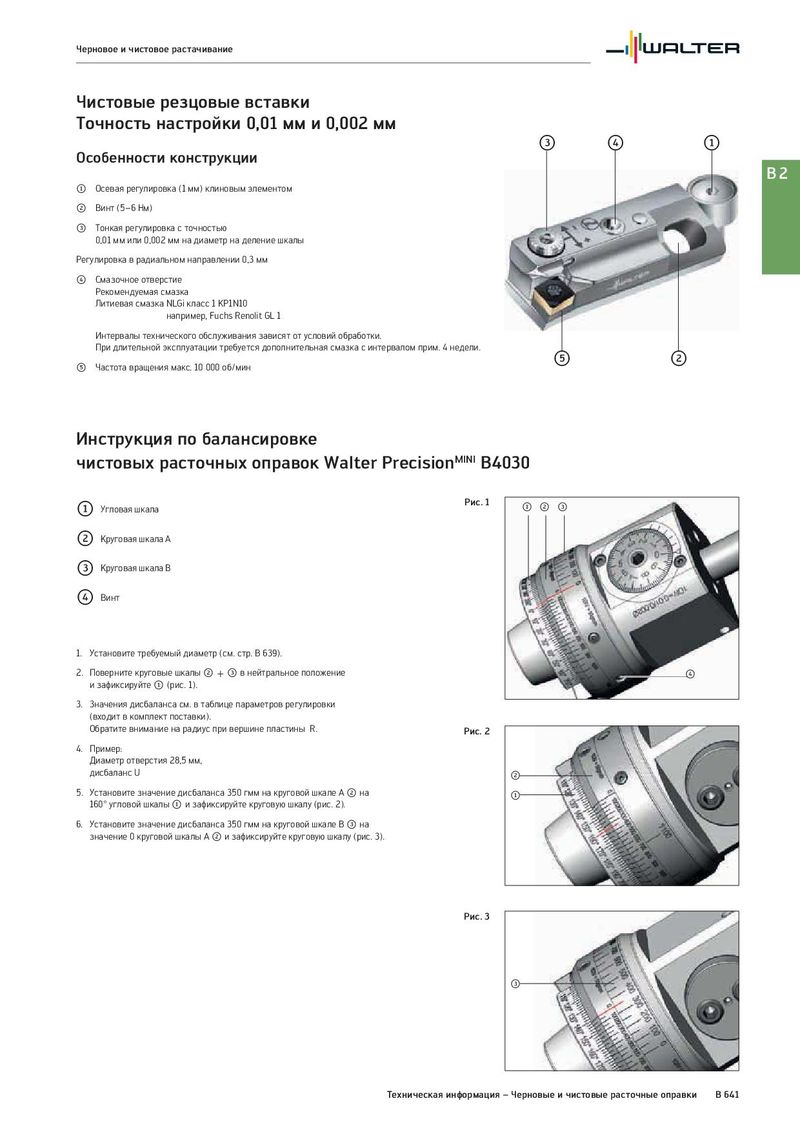 Черновое и чистовое растачивание Чистовые резцовые вставки Точность настройки 0,01 мм и 0,002 мм Особенности конструкции z { x B2 x Осевая регулировка (1 мм) клиновым элементом y Винт (5–6 Нм) z Тонкая регулировка с точностью 0,01 мм или 0,002 мм на диаметр на деление шкалы Регулировка в радиальном направлении 0,3 мм { Смазочное отверстие Рекомендуемая смазка Литиевая смазка NLGi класс 1 KP1N10 например, Fuchs Renolit GL 1 Интервалы технического обслуживания зависят от условий обработки. При длительной эксплуатации требуется дополнительная смазка с интервалом прим. 4 недели. | y | Частота вращения макс. 10 000 об/мин Инструкция по балансировке чистовых расточных оправок Walter PrecisionMINI B4030 x Угловая шкала Рис. 1 x y z y Круговая шкала A z Круговая шкала B { Винт 1. Установите требуемый диаметр (см. стр. B 639). 2. Поверните круговые шкалы y + z в нейтральное положение { и зафиксируйте x (рис. 1). 3. Значения дисбаланса см. в таблице параметров регулировки (входит в комплект поставки). Обратите внимание на радиус при вершине пластины R. Рис. 2 4. Пример: Диаметр отверстия 28,5 мм, дисбаланс U y 5. Установите значение дисбаланса 350 гмм на круговой шкале A y на x 160° угловой шкалы x и зафиксируйте круговую шкалу (рис. 2). 6. Установите значение дисбаланса 350 гмм на круговой шкале B z на значение 0 круговой шкалы A y и зафиксируйте круговую шкалу (рис. 3). Рис. 3 z Техническая информация – Черновые и чистовые расточные оправки B 641