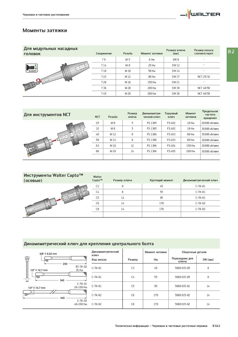 Черновое и чистовое растачивание Моменты затяжки Для модульных насадных Размер ключа Размер конуса B2 головок Соединение Резьба Момент затяжки [мм] соответствует T9 M5 6 Нм SW 8 — T 14 M8 25 Нм SW 12 — T 18 M 10 50 Нм SW 14 — T 22 M 12 80 Нм SW 17 NCT 25/32 T 28 M 16 150 Нм SW 21 — T 36 M 20 200 Нм SW 30 NCT 40/50 T 45 M 20 200 Нм SW 36 NCT 40/50 Размер Динамометри- Торцовый Момент Предельная Для инструментов NCT NCT Резьба ключа ческий ключ ключ затяжки частота вращения 25 M8 5 FS 1385 FS 402 18 Нм 20.000 об/мин 32 M8 5 FS 1385 FS 402 18 Нм 30.000 об/мин 40 M 12 8 FS 1386 FS 403 80 Нм 30.000 об/мин 50 M 12 8 FS 1386 FS 403 80 Нм 30.000 об/мин 63 M 16 12 FS 1386 FS 404 150 Нм 30.000 об/мин 80 M 20 14 FS 1386 FS 405 200 Нм 30.000 об/мин Инструменты Walter Capto™ Walter (осевые) Capto™ Размер ключа Крутящий момент Динамометрический ключ C3 8 45 C-TK-01 C4 8 55 C-TK-01 C5 14 95 C-TK-01 C6 14 170 C-TK-02 C8 14 170 C-TK-02 Динамометрический ключ для крепления центрального болта Динамометрический Момент затяжки Сборочные детали ключ Код заказа. Размер Нм Переходник для SW [мм] ключа BT-TK-02 C-TK-01 C3 45 5680 015-05 8 35 Нм C-TK-01 C4 55 5680 015-05 8 C-TK-01 C-TK-01 C5 95 5680 015-01 14 20-100 Нм C-TK-02 C6 170 5680 015-02 14 C-TK-02 40-200 Нм C-TK-02 C8 170 5680 015-02 14 Техническая информация – Черновые и чистовые расточные оправки B 643