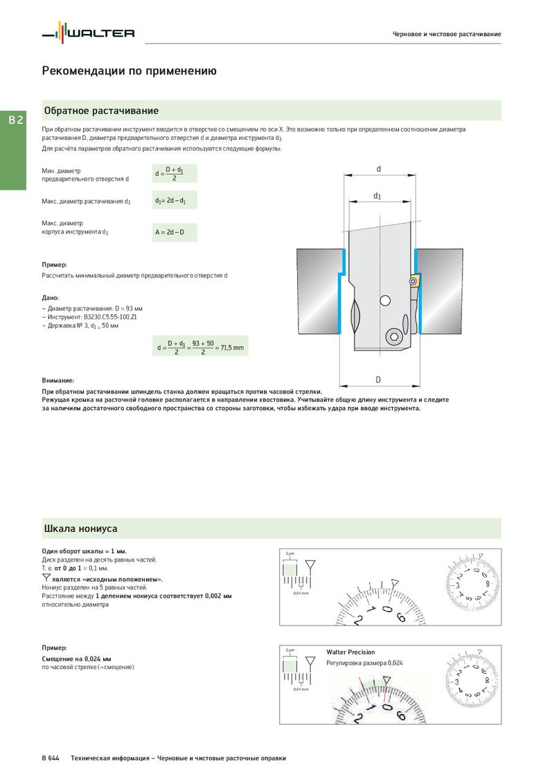Черновое и чистовое растачивание Рекомендации по применению Обратное растачивание B2 При обратном растачивании инструмент вводится в отверстие со смещением по оси X. Это возможно только при определенном соотношении диаметра растачивания D, диаметра предварительного отверстия d и диаметра инструмента d1. Для расчёта параметров обратного растачивания используются следующие формулы: Мин. диаметр d предварительного отверстия d Макс. диаметр растачивания d1 d1 Макс. диаметр корпуса инструмента d1 Пример: Рассчитать минимальный диаметр предварительного отверстия d Дано: – Диаметр растачивания: D = 93 мм – Инструмент: B3230.C5.55-100.Z1 – Державка № 3, d1 = 50 мм Внимание: D При обратном растачивании шпиндель станка должен вращаться против часовой стрелки. Режущая кромка на расточной головке располагается в направлении хвостовика. Учитывайте общую длину инструмента и следите за наличием достаточного свободного пространства со стороны заготовки, чтобы избежать удара при вводе инструмента. Шкала нониуса Один оборот шкалы = 1 мм. 2 μm Диск разделен на десять равных частей. Т. е. от 0 до 1 = 0,1 мм. является «исходным положением». Нониус разделен на 5 равных частей. Расстояние между 1 делением нониуса соответствует 0,002 мм 0,01 mm относительно диаметра Пример: 2 μm Walter Precision Смещение на 0,024 мм Регулировка размера 0,024 по часовой стрелке (+смещение) 0,01 mm B 644 Техническая информация – Черновые и чистовые расточные оправки