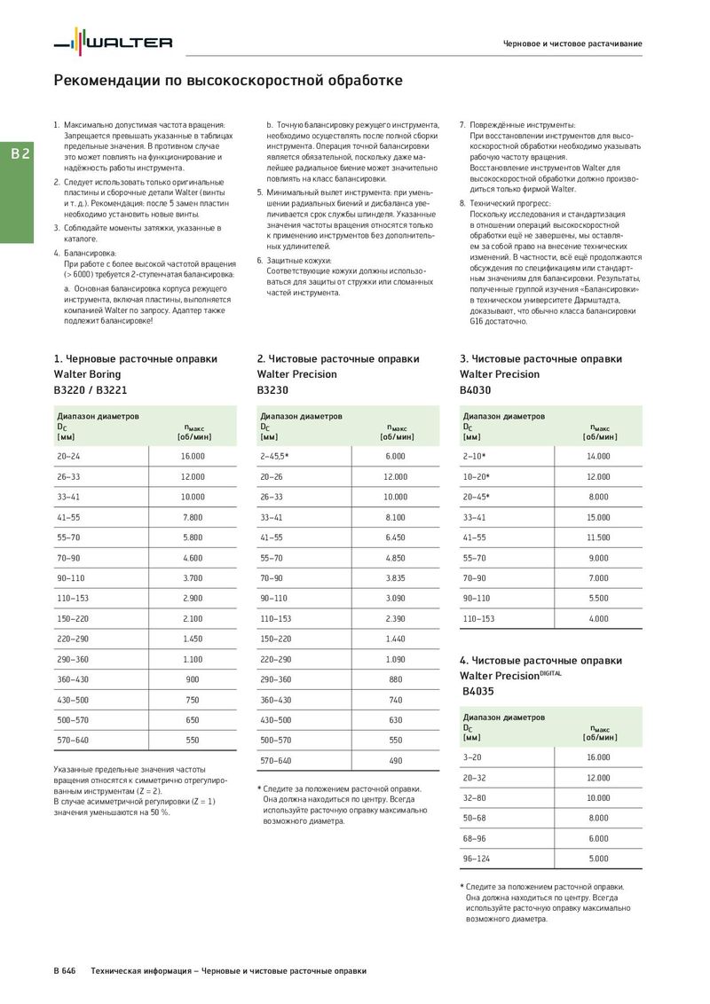 Черновое и чистовое растачивание Рекомендации по высокоскоростной обработке 1. Максимально допустимая частота вращения: b. Точную балансировку режущего инструмента, 7. Повреждённые инструменты: Запрещается превышать указанные в таблицах необходимо осуществлять после полной сборки При восстановлении инструментов для высо- B2 предельные значения. В противном случае инструмента. Операция точной балансировки коскоростной обработки необходимо указывать это может повлиять на функционирование и является обязательной, поскольку даже ма- рабочую частоту вращения. надёжность работы инструмента. лейшее радиальное биение может значительно Восстановление инструментов Walter для 2. Следует использовать только оригинальные повлиять на класс балансировки. высокоскоростной обработки должно произво- пластины и сборочные детали Walter (винты 5. Минимальный вылет инструмента: при умень- диться только фирмой Walter. и т. д.). Рекомендация: после 5 замен пластин шении радиальных биений и дисбаланса уве- 8. Технический прогресс: необходимо установить новые винты. личивается срок службы шпинделя. Указанные Поскольку исследования и стандартизация 3. Соблюдайте моменты затяжки, указанные в значения частоты вращения относятся только в отношении операций высокоскоростной каталоге. к применению инструментов без дополнитель- обработки ещё не завершены, мы оставля- 4. Балансировка: ных удлинителей. ем за собой право на внесение технических При работе с более высокой частотой вращения 6. Защитные кожухи: изменений. В частности, всё ещё продолжаются (> 6000) требуется 2-ступенчатая балансировка: Соответствующие кожухи должны использо- обсуждения по спецификациям или стандарт- ваться для защиты от стружки или сломанных ным значениям для балансировки. Результаты, a. Основная балансировка корпуса режущего частей инструмента. полученные группой изучения «Балансировки» инструмента, включая пластины, выполняется в техническом университете Дармштадта, компанией Walter по запросу. Адаптер также доказывают, что обычно класса балансировки подлежит балансировке! G16 достаточно. 1. Черновые расточные оправки 2. Чистовые расточные оправки 3. Чистовые расточные оправки Walter Boring Walter Precision Walter Precision B3220 / B3221 B3230 B4030 Диапазон диаметров Диапазон диаметров Диапазон диаметров DC nмакс DC nмакс DC nмакс [мм] [об/мин] [мм] [об/мин] [мм] [об/мин] 20–24 16.000 2–45,5* 6.000 2–10* 14.000 26–33 12.000 20–26 12.000 10–20* 12.000 33–41 10.000 26–33 10.000 20–45* 8.000 41–55 7.800 33–41 8.100 33–41 15.000 55–70 5.800 41–55 6.450 41–55 11.500 70–90 4.600 55–70 4.850 55–70 9.000 90–110 3.700 70–90 3.835 70–90 7.000 110–153 2.900 90–110 3.090 90–110 5.500 150–220 2.100 110–153 2.390 110–153 4.000 220–290 1.450 150–220 1.440 290–360 1.100 220–290 1.090 4. Чистовые расточные оправки 360–430 900 290–360 880 Walter PrecisionDIGITAL B4035 430–500 750 360–430 740 500–570 650 430–500 630 Диапазон диаметров DC nмакс 570–640 550 500–570 550 [мм] [об/мин] 570–640 490 3–20 16.000 Указанные предельные значения частоты вращения относятся к симметрично отрегулиро- 20–32 12.000 ванным инструментам (Z = 2). * Следите за положением расточной оправки. В случае асимметричной регулировки (Z = 1) Она должна находиться по центру. Всегда 32–80 10.000 значения уменьшаются на 50 %. используйте расточную оправку максимально возможного диаметра. 50–68 8.000 68–96 6.000 96–124 5.000 * Следите за положением расточной оправки. Она должна находиться по центру. Всегда используйте расточную оправку максимально возможного диаметра. B 646 Техническая информация – Чернов