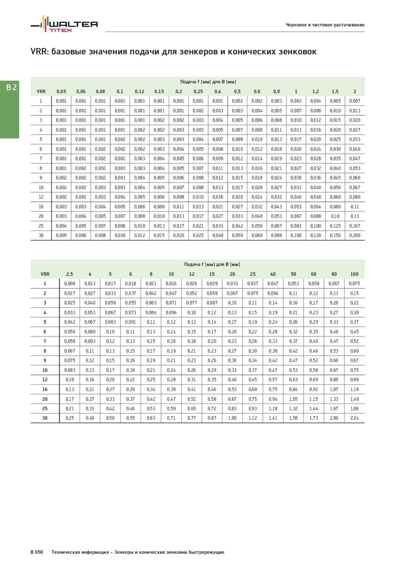 Черновое и чистовое растачивание VRR: базовые значения подачи для зенкеров и конических зенковок Подача f [мм] для Ø [мм] B2 VRR 0,05 0,06 0,08 0,1 0,12 0,15 0,2 0,25 0,4 0,5 0,6 0,8 1 1,2 1,5 2 1 0,001 0,001 0,001 0,001 0,001 0,001 0,001 0,001 0,001 0,002 0,002 0,003 0,003 0,004 0,005 0,007 2 0,001 0,001 0,001 0,001 0,001 0,001 0,001 0,002 0,003 0,003 0,004 0,005 0,007 0,008 0,010 0,013 3 0,001 0,001 0,001 0,001 0,001 0,002 0,002 0,003 0,004 0,005 0,006 0,008 0,010 0,012 0,015 0,020 4 0,001 0,001 0,001 0,001 0,002 0,002 0,003 0,003 0,005 0,007 0,008 0,011 0,013 0,016 0,020 0,027 5 0,001 0,001 0,001 0,002 0,002 0,003 0,003 0,004 0,007 0,008 0,010 0,013 0,017 0,020 0,025 0,033 6 0,001 0,001 0,002 0,002 0,002 0,003 0,004 0,005 0,008 0,010 0,012 0,016 0,020 0,024 0,030 0,040 7 0,001 0,001 0,002 0,002 0,003 0,004 0,005 0,006 0,009 0,012 0,014 0,019 0,023 0,028 0,035 0,047 8 0,001 0,002 0,002 0,003 0,003 0,004 0,005 0,007 0,011 0,013 0,016 0,021 0,027 0,032 0,040 0,053 9 0,002 0,002 0,002 0,003 0,004 0,005 0,006 0,008 0,012 0,015 0,018 0,024 0,030 0,036 0,045 0,060 10 0,002 0,002 0,003 0,003 0,004 0,005 0,007 0,008 0,013 0,017 0,020 0,027 0,033 0,040 0,050 0,067 12 0,002 0,002 0,003 0,004 0,005 0,006 0,008 0,010 0,016 0,020 0,024 0,032 0,040 0,048 0,060 0,080 16 0,003 0,003 0,004 0,005 0,006 0,008 0,011 0,013 0,021 0,027 0,032 0,043 0,053 0,064 0,080 0,11 20 0,003 0,004 0,005 0,007 0,008 0,010 0,013 0,017 0,027 0,033 0,040 0,053 0,067 0,080 0,10 0,13 25 0,004 0,005 0,007 0,008 0,010 0,013 0,017 0,021 0,033 0,042 0,050 0,067 0,083 0,100 0,125 0,167 30 0,005 0,006 0,008 0,010 0,012 0,015 0,020 0,025 0,040 0,050 0,060 0,080 0,100 0,120 0,150 0,200 Подача f [мм] для Ø [мм] VRR 2,5 4 5 6 8 10 12 15 20 25 40 50 60 80 100 1 0,008 0,013 0,017 0,018 0,021 0,024 0,026 0,029 0,033 0,037 0,047 0,053 0,058 0,067 0,075 2 0,017 0,027 0,033 0,037 0,042 0,047 0,052 0,058 0,067 0,075 0,094 0,11 0,12 0,13 0,15 3 0,025 0,040 0,050 0,055 0,063 0,071 0,077 0,087 0,10 0,11 0,14 0,16 0,17 0,20 0,22 4 0,033 0,053 0,067 0,073 0,084 0,094 0,10 0,12 0,13 0,15 0,19 0,21 0,23 0,27 0,30 5 0,042 0,067 0,083 0,091 0,11 0,12 0,13 0,14 0,17 0,19 0,24 0,26 0,29 0,33 0,37 6 0,050 0,080 0,10 0,11 0,13 0,14 0,15 0,17 0,20 0,22 0,28 0,32 0,35 0,40 0,45 7 0,058 0,093 0,12 0,13 0,15 0,16 0,18 0,20 0,23 0,26 0,33 0,37 0,40 0,47 0,52 8 0,067 0,11 0,13 0,15 0,17 0,19 0,21 0,23 0,27 0,30 0,38 0,42 0,46 0,53 0,60 9 0,075 0,12 0,15 0,16 0,19 0,21 0,23 0,26 0,30 0,34 0,42 0,47 0,52 0,60 0,67 10 0,083 0,13 0,17 0,18 0,21 0,24 0,26 0,29 0,33 0,37 0,47 0,53 0,58 0,67 0,75 12 0,10 0,16 0,20 0,22 0,25 0,28 0,31 0,35 0,40 0,45 0,57 0,63 0,69 0,80 0,89 16 0,13 0,21 0,27 0,29 0,34 0,38 0,41 0,46 0,53 0,60 0,75 0,84 0,92 1,07 1,19 20 0,17 0,27 0,33 0,37 0,42 0,47 0,52 0,58 0,67 0,75 0,94 1,05 1,15 1,33 1,49 25 0,21 0,33 0,42 0,46 0,53 0,59 0,65 0,72 0,83 0,93 1,18 1,32 1,44 1,67 1,86 30 0,25 0,40 0,50 0,55 0,63 0,71 0,77 0,87 1,00 1,12 1,41 1,58 1,73 2,00 2,24 B 650 Техническая информация – Зенкеры и конические зенковки быстрорежущие