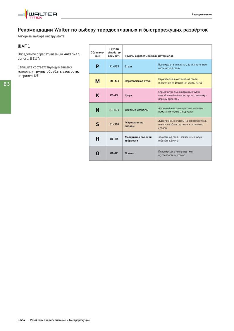 Развёртывание Рекомендации Walter по выбору твердосплавных и быстрорежущих развёрток Алгоритм выбора инструмента ШАГ 1 Группы Определите обрабатываемый материал, Обозначе- обрабаты- см. стр. B 1174: ние ваемости Группы обрабатываемых материалов Запишите соответствующую вашему P P1–P15 Сталь Все виды стали и литья, за исключением аустенитной стали материалу группу обрабатываемости, например: K5. M M1–M3 Нержавеющая сталь Нержавеющая аустенитная сталь B3 и аустенитно-ферритная сталь, литьё Серый чугун, высокопрочный чугун, K K1–K7 Чугун ковкий литейный чугун, чугун с вермику- лярным графитом N N1–N10 Цветные металлы Алюминий и прочие цветные металлы, неметаллические материалы Жаропрочные Жаропрочные сплавы на основе железа, S S1–S10 сплавы никеля и кобальта; титан и титановые сплавы H H1–H4 Материалы высокой Закалённая сталь, закалённый чугун, твёрдости отбелённый чугун O O1–O6 Прочее Пластмассы, стеклопластики и углепластики, графит B 654 Развёртки твердосплавные и быстрорежущие